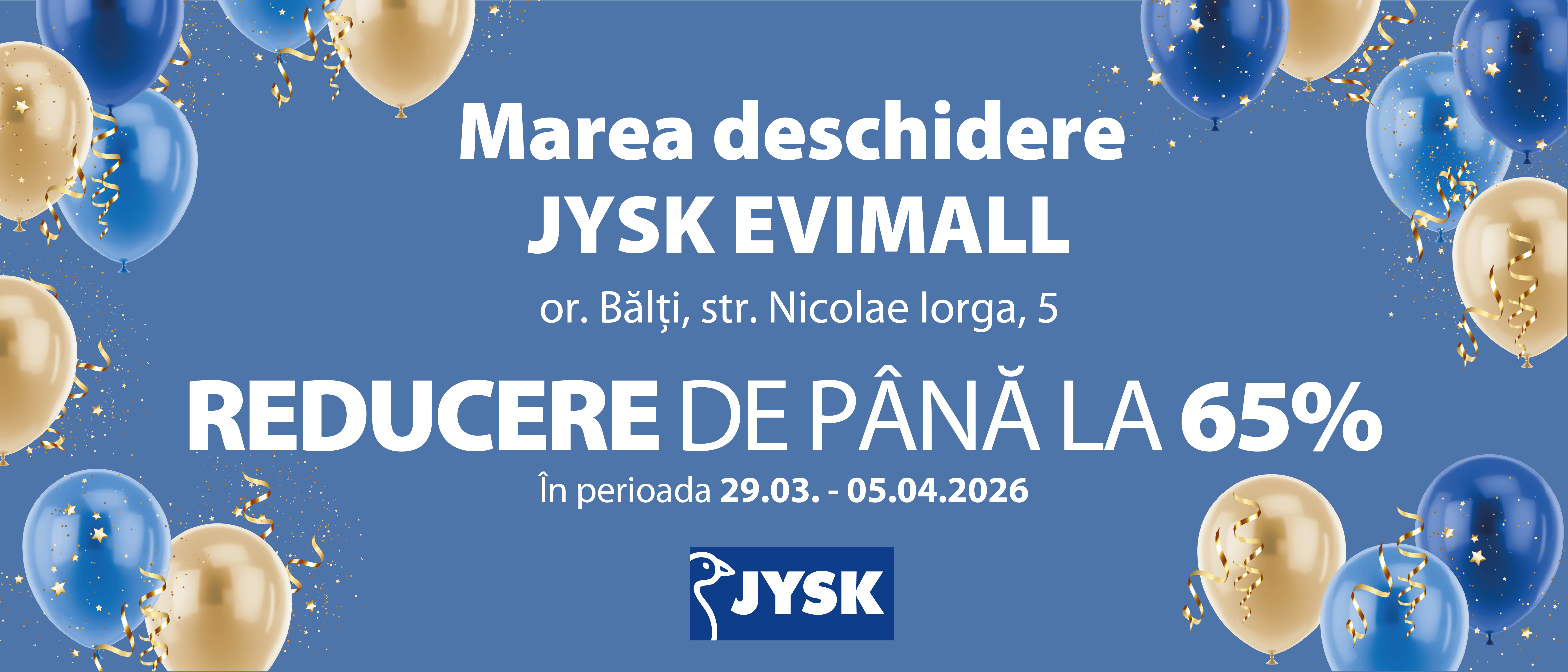 Duminică, 29 martie la ora 13:00, JYSK anunță deschiderea magazinului EVIMALL JYSK BĂLȚI, situat în or. Bălți, pe str. Nicolae Iorga 5. Cu ocazia redeschiderii, toți vizitatorii vor fi întâmpinați cu oferte speciale și surprize.