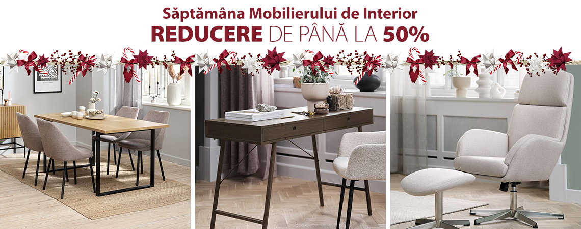 Între 11.12 - 17.12.2025 te așteptăm la Săptămâna Mobilierului de Interior cu reduceri de până la 50% la mobilierul de interior. Fă-ți casa un loc mai confortabil, alege noi articole și profită de ofertele la dulapuri, fotolii, comode cu sertare, mese de dining și scaune de dining, biblioteci, cadre de pat și multe altele. Vezi ofertele la mobilier pentru dormitor, camera de zi, dining, birou.