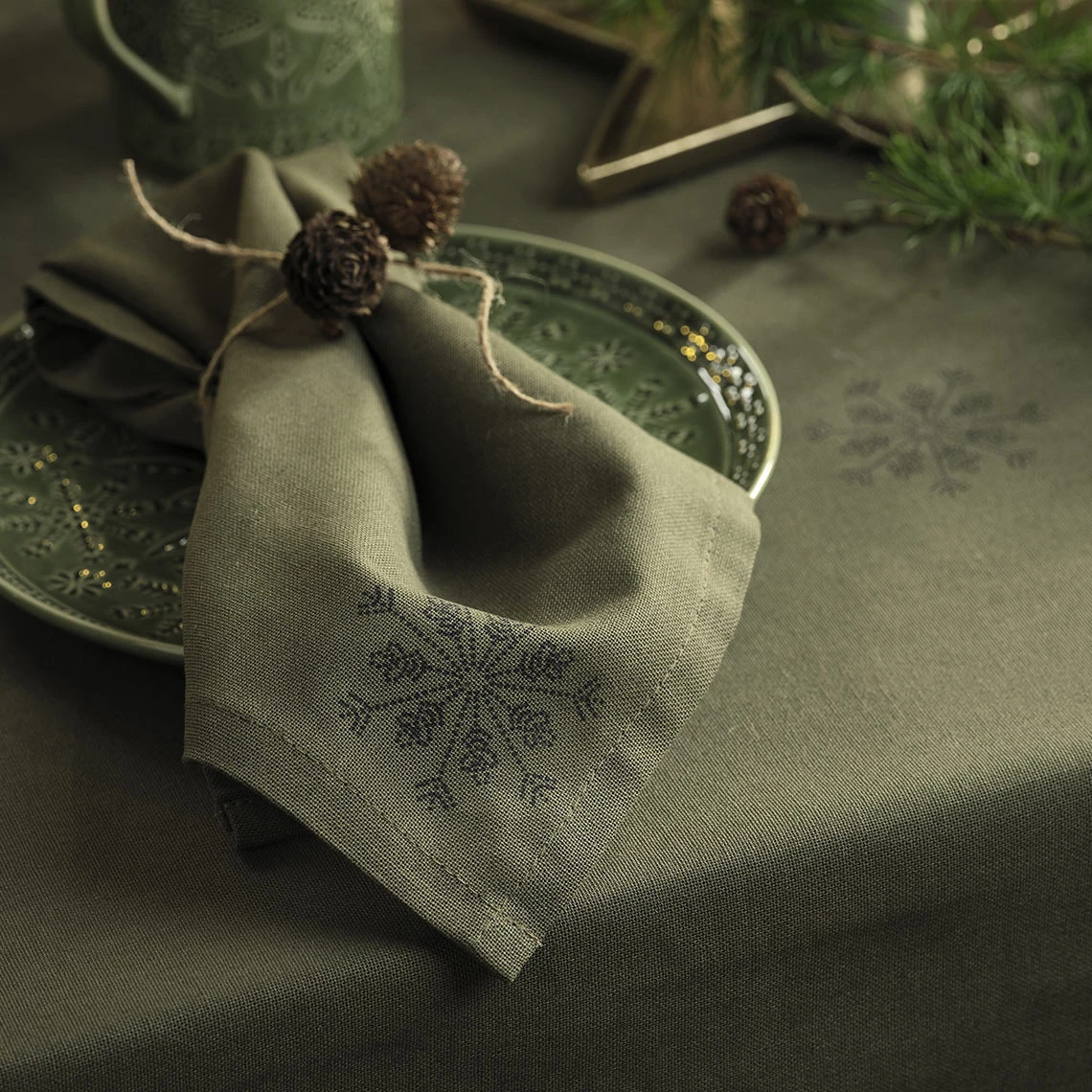 | Colecția Nordic Mood de Crăciun include o față de masă verde cu imprimeuri delicate de fulgi de zăpadă. Fața de masă face parte din seria STJERNESTEN, care include și un șervet de Crăciun. În combinație, fața de masă și șervetul atrag atenția asupra decorului de pe masa ta.