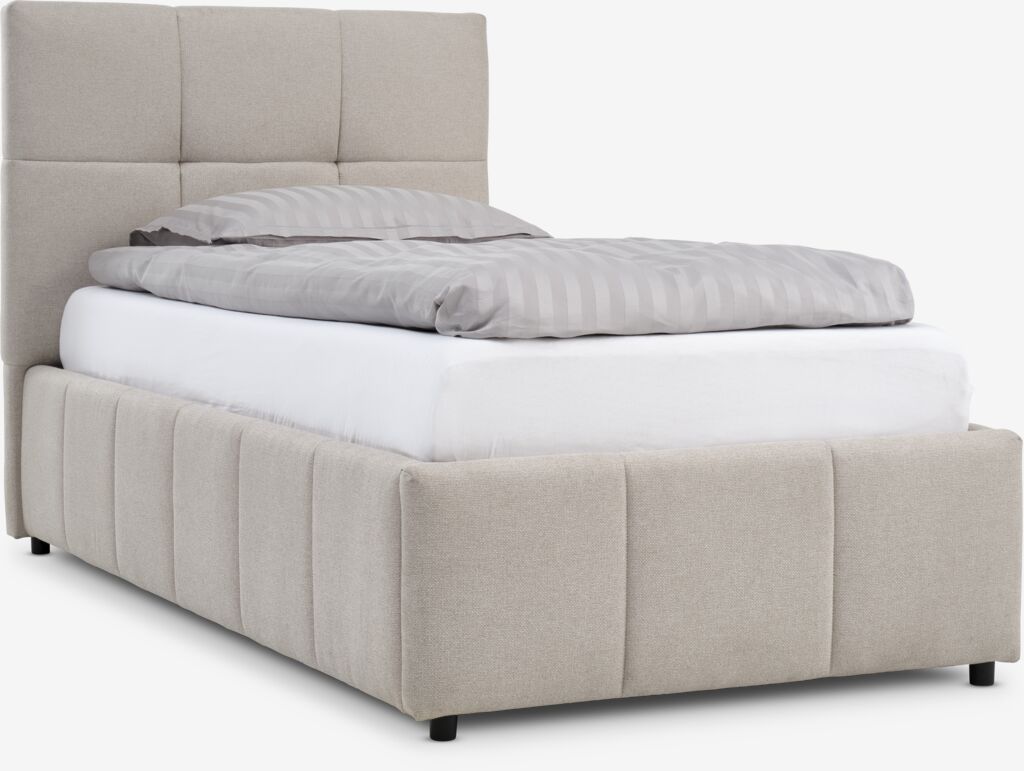 Cadru de pat din material textil. Cu spațiu de depozitare și somieră cu ridicare hidraulică. I se potrivește orice saltea 90x200 cm. Incl. somieră. Excl. saltea. 100x217x115 cm