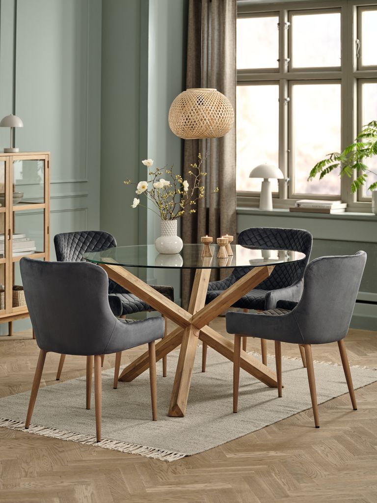 Masă: Lemn masiv de stejar și sticlă securizată. Ø119x75 cm Scaun: Catifea și oțel.