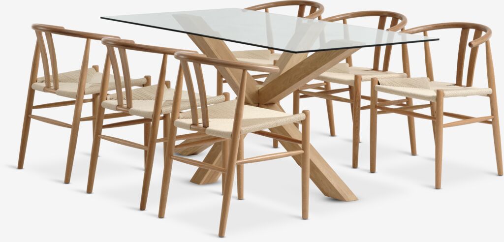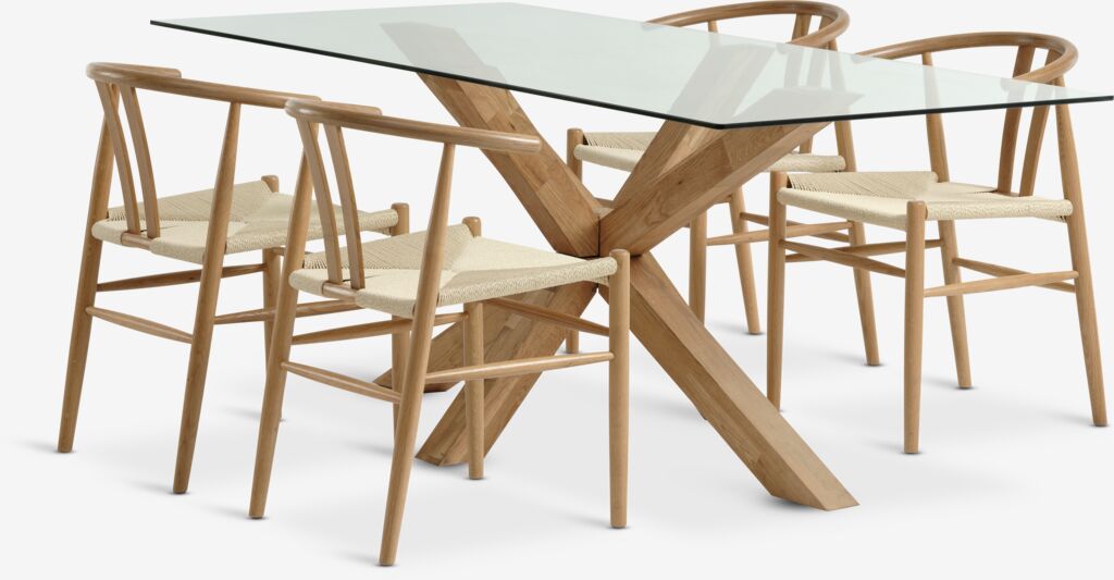 Masă: Lemn masiv de stejar și sticlă securizată. 90x160x75 cm. Scaun: Lemn masiv de stejar și fire de hârtie.