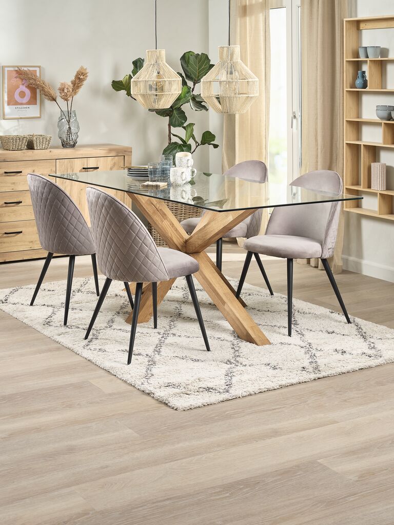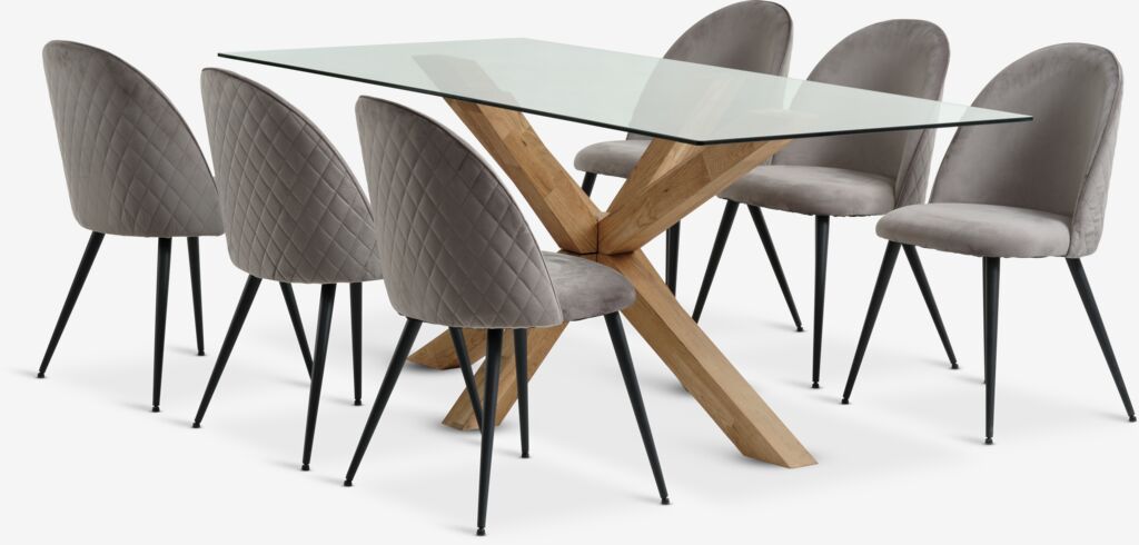 Masă: Stejar masiv și sticlă securizată. 90x190x75 cm. Scaun: Catifea și oțel.