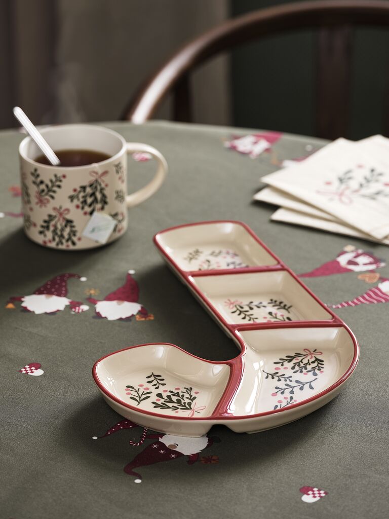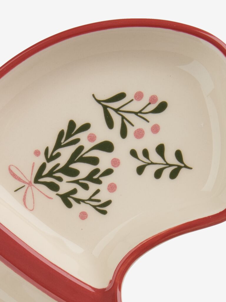 Bol din ceramică crem, în formă de acadea de Crăciun, cu decorațiuni festive. Perfect pentru servirea dulciurilor și gustărilor în timpul sărbătorilor. Bolul se poate spăla la mașina de spălat vase. 22x32x2,5 cm