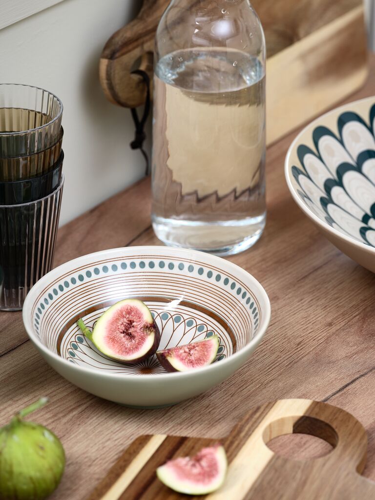 Bol din ceramică cu un model exotic în culori de bej și turcoaz. Se poate spăla la mașina de spălat vase. Ø18x6 cm