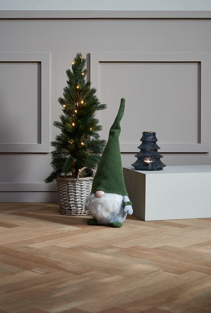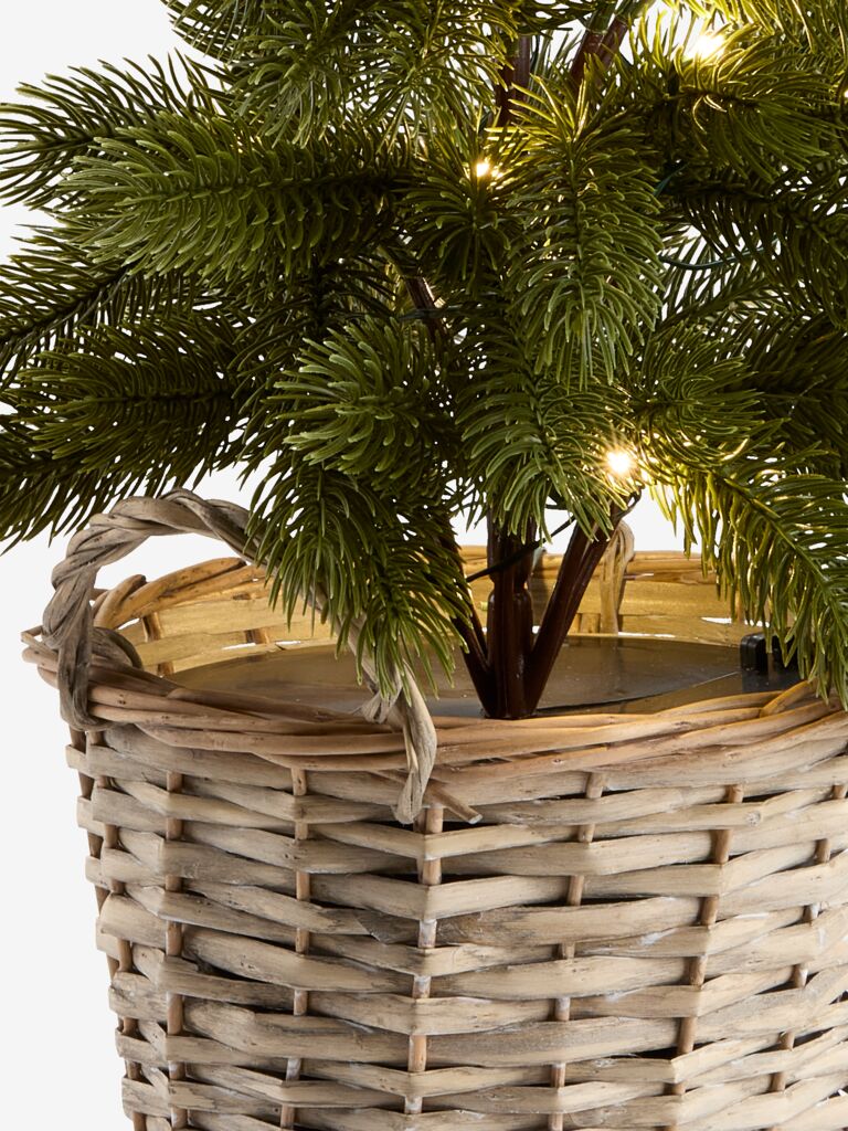 Brad artificial cu 25 de lumini LED care oferă o strălucire caldă și primitoare. Decorați-l cu propriile decorațiuni de Crăciun pentru o notă mai personală. Pomul artificial este așezat într-un ghiveci din răchită. Necesită 3 baterii AA (neincluse). Ø28x75 cm