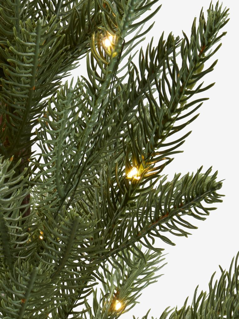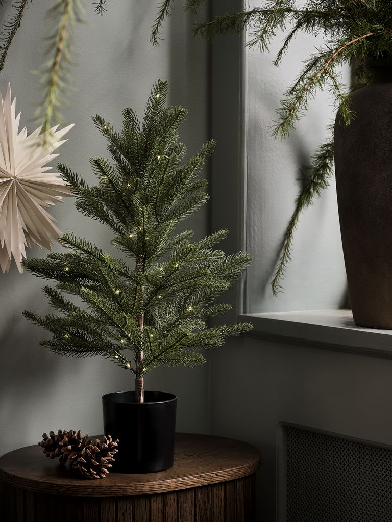 Brad artificial, decorat cu 40 de luminițe LED, așezat într-un ghiveci simplu negru. Puteți adăuga mai multe decorațiuni bradului pentru a-l face și mai festiv. Bradul are funcție de temporizator care aprinde automat luminile la ora 6 și le stinge la ora 18. Necesită 3 baterii AA (nu sunt incluse). Ø42 x H60 cm