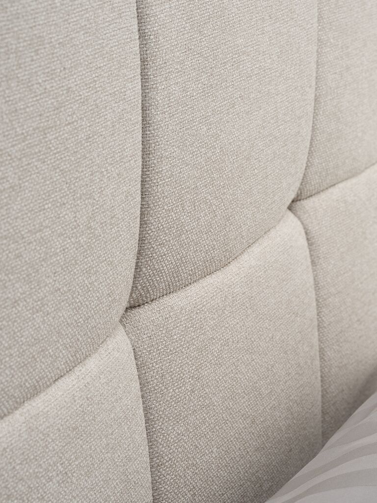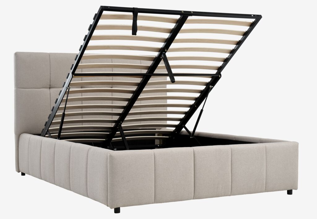 Cadru de pat din material textil. Cu spațiu de depozitare și somieră cu ridicare hidraulică. I se potrivește orice saltea 120x200 cm. Incl. somieră. Excl. saltea. 140x217x115 cm