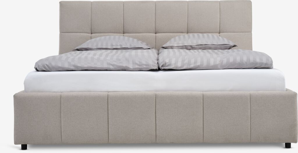 Cadru de pat din material textil. Cu spațiu de depozitare și somieră cu ridicare hidraulică. I se potrivește orice saltea 160x200 cm. Incl. somieră. Excl. saltea. 180x217x115 cm
