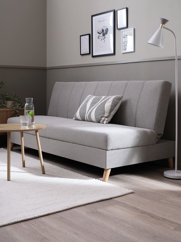 Canapea cu 3 locuri din material textil. Canapeaua se transformă ușor într-un pat. Perne din spumă. Picioare din lemn masiv. Zona de dormit 106x190 cm. 209 x81x82 cm