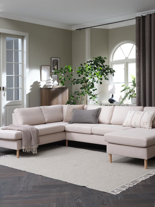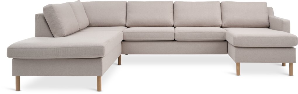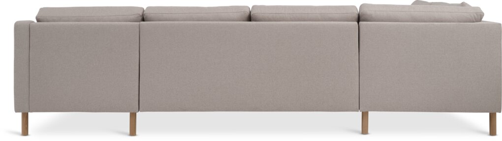 Canapea cu șase locuri. Șezut și spătar din spumă poliuretanică. Picioare din lemn masiv de stejar. Nereversibilă. Dimensiuni: 292x7x90/137x201 cm.