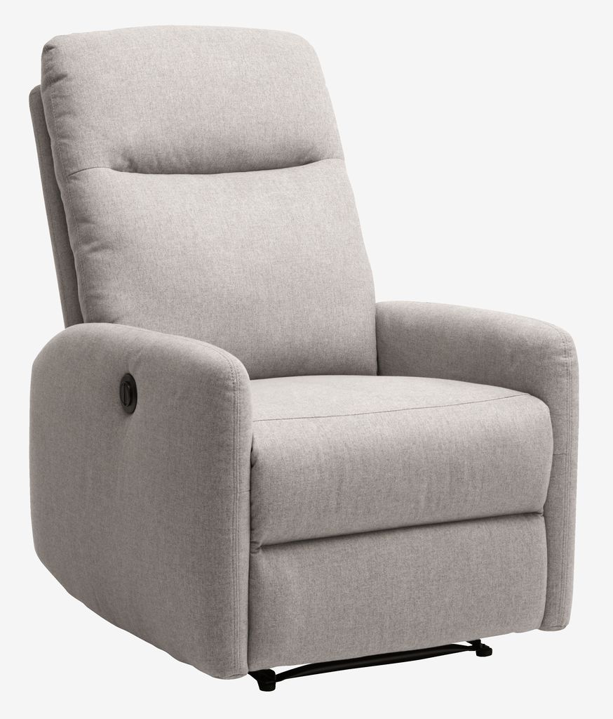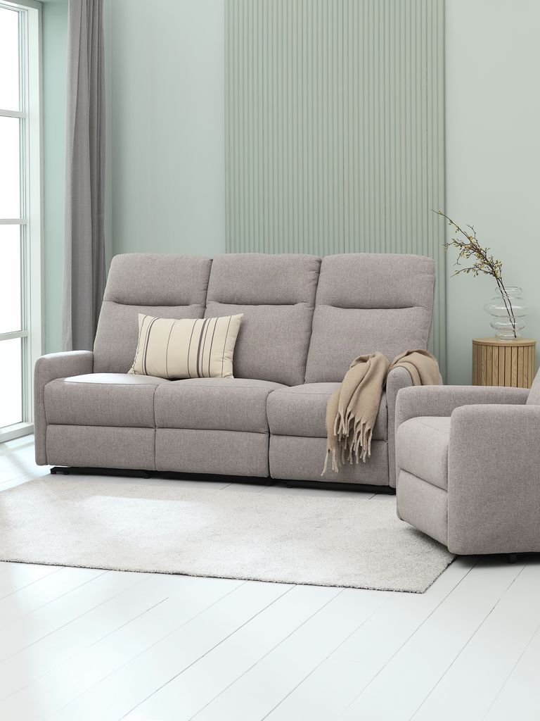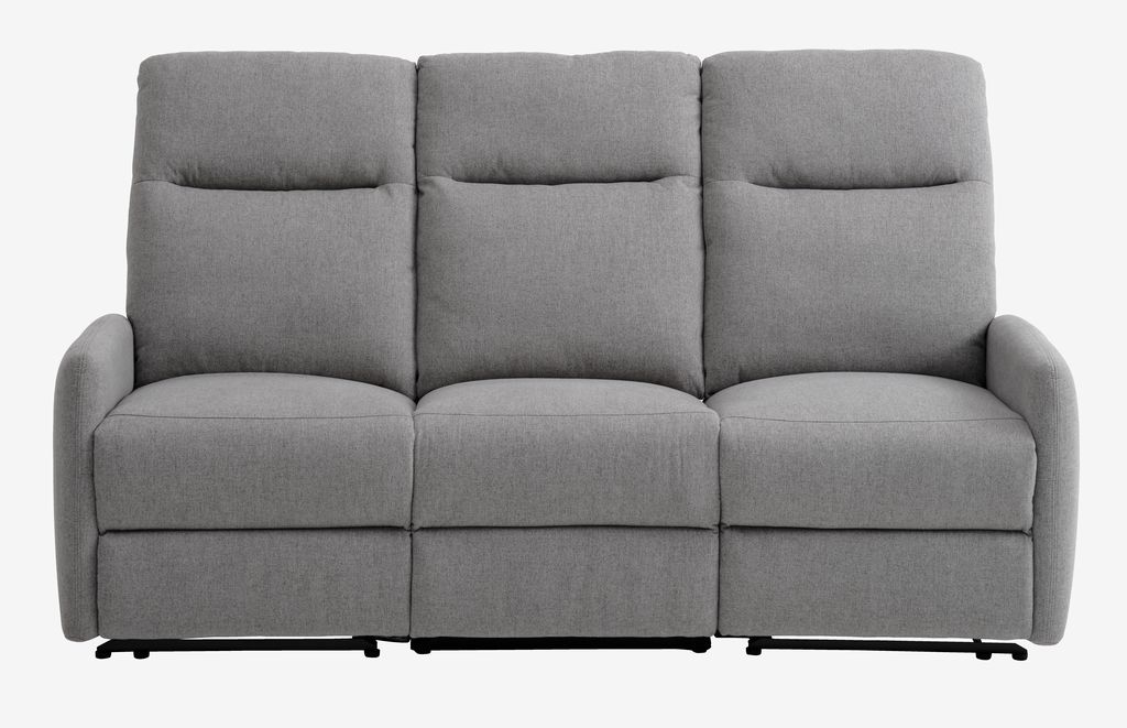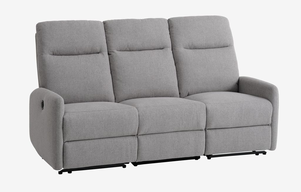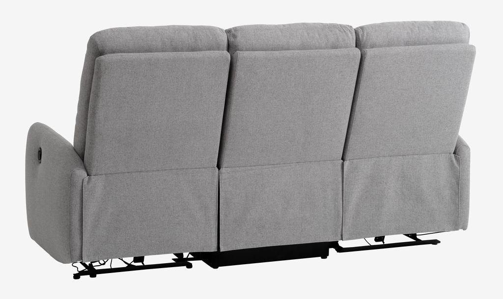 Canapea 3 locuri din material textil. Perne din spuma. Baza din oțel. Cele două scaune de la capăt au mecanism de înclinare fără trepte acționat electric și suport pentru picioare integrat. 195x110x97 cm