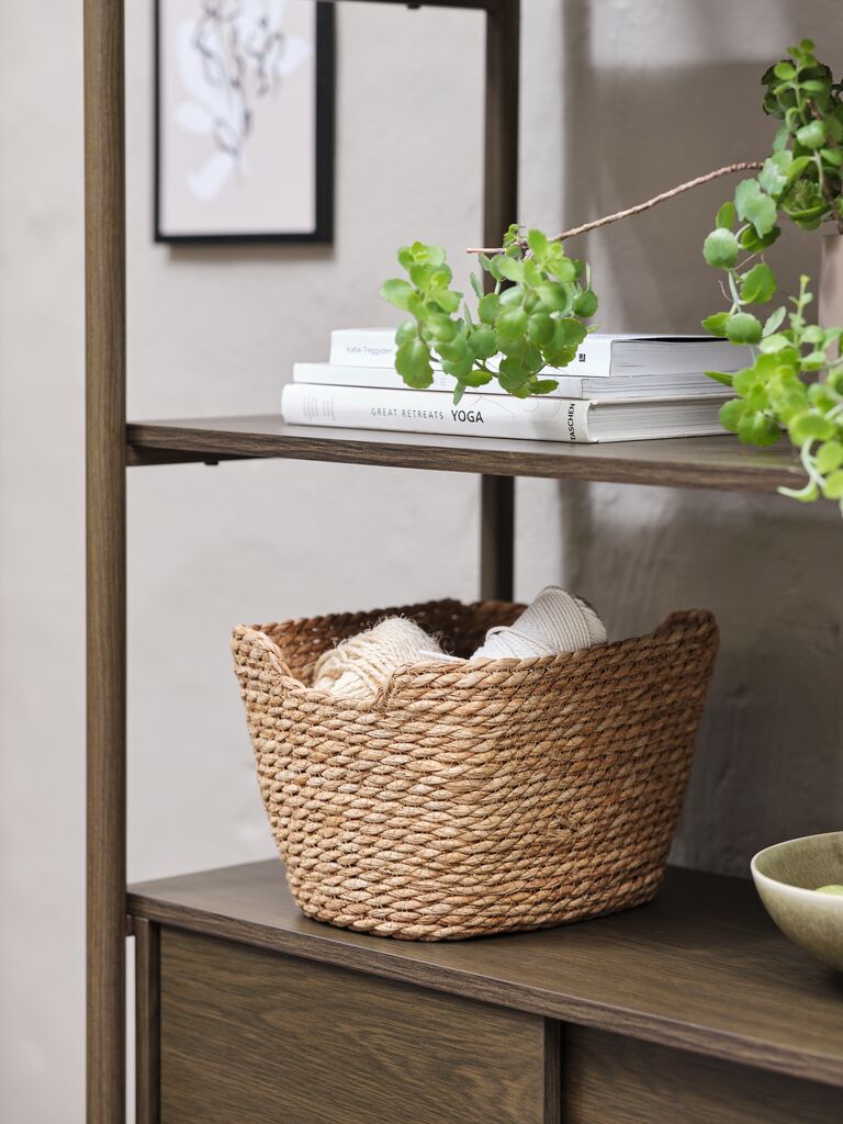 Coș realizat din papură naturală. Textura sa împletită oferă o modalitate decorativă de a organiza articolele mai mici. Mânerele fac coșul ușor de ridicat și de mutat. 26x32x23 cm
