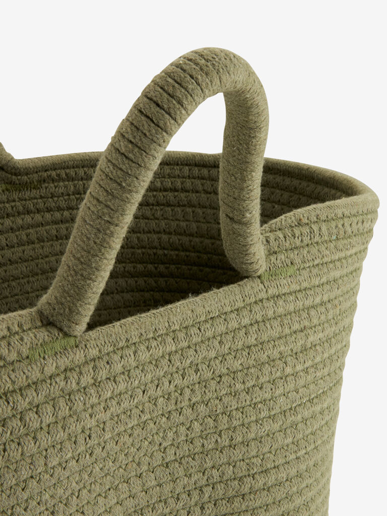 Coș dintr-o țesătură moale, împletită, de culoare măsliniu închis. O soluție practică de depozitare pentru articole precum pături sau jucării, prevăzut cu două mânere care îl fac ușor de mutat. l30 x L41 x H30 cm