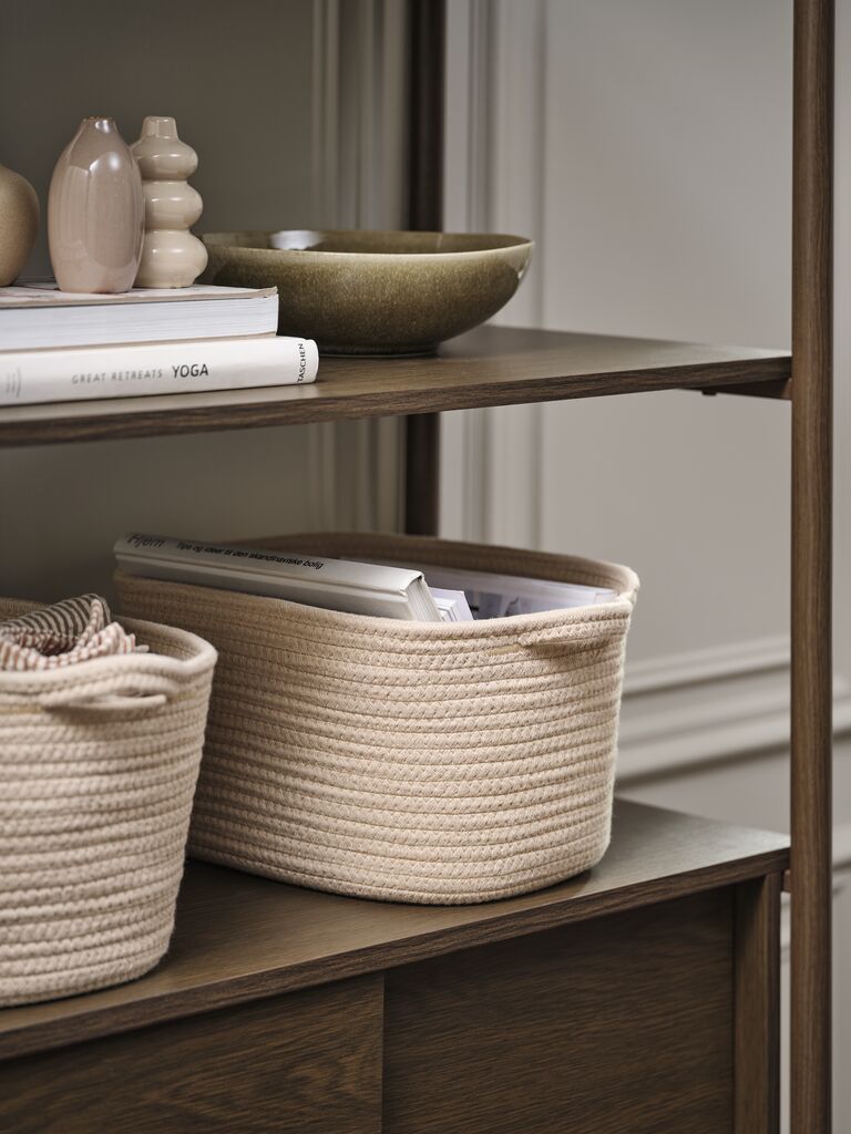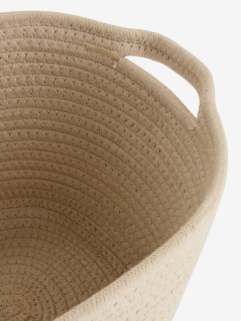 Coș de culoare bej neutru, cu un design moale, împletit. Ideal pentru organizarea obiectelor mai mici pe rafturi sau în dulapuri. Mânerele integrate îl fac ușor de ridicat și de transportat. l27 x L35 x H18 cm