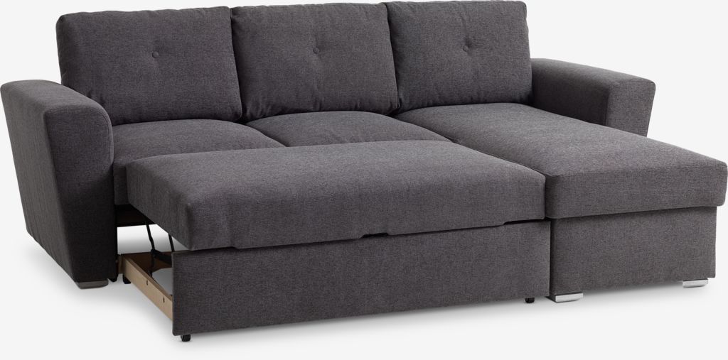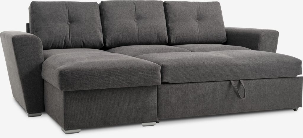 Colțar cu 3 locuri din material textil. Canapeaua se poate transforma cu ușurință într-un pat. Perne din spumă. Cu spațiu de depozitare. Poate fi inversat. Suprafață extinsă 141x195 cm. 243x86x83/154 cm