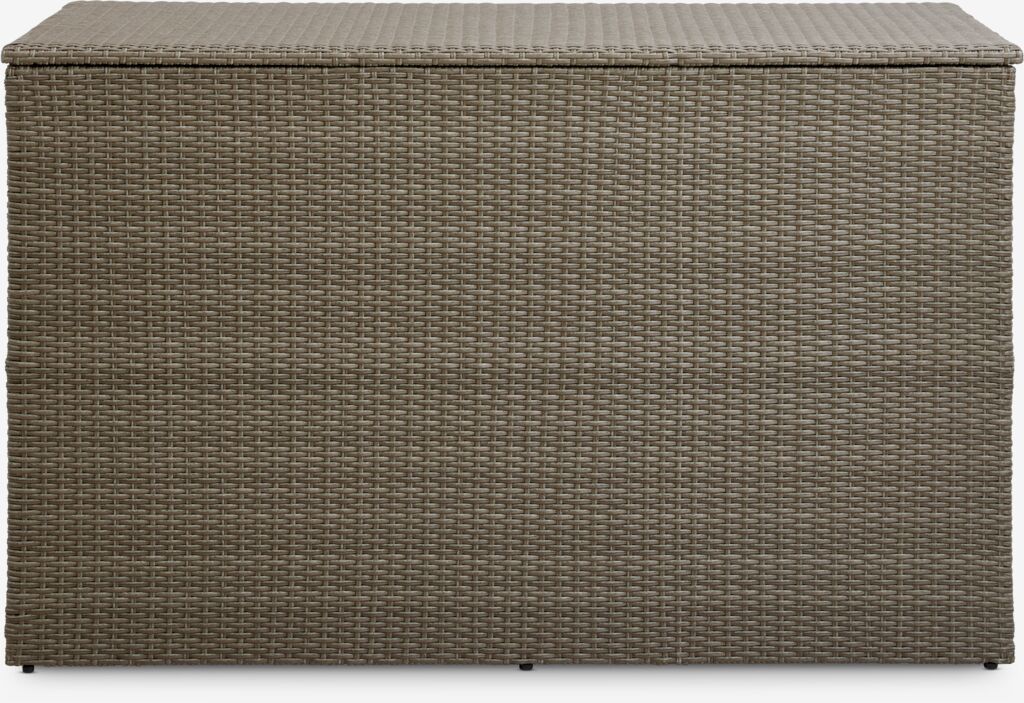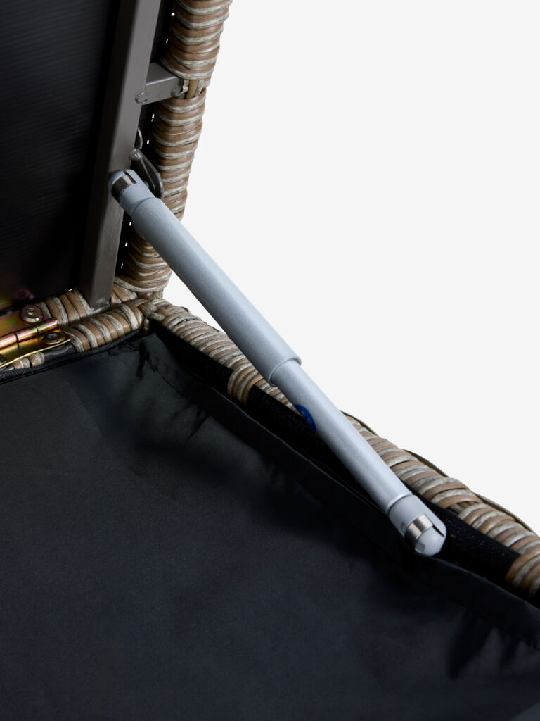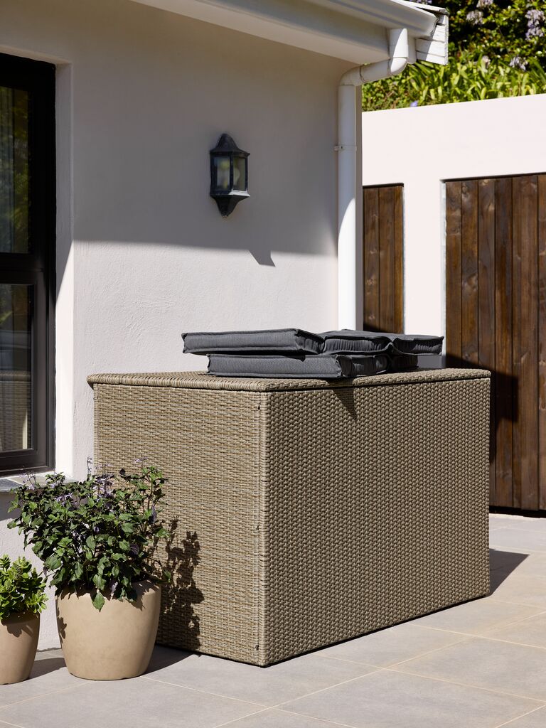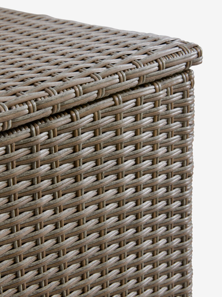 Cutie pentru depozitarea pernelor din oțel și poliratan. Cu capac hidraulic ușor de folosit, roți și mâner. 133x64x55 cm
