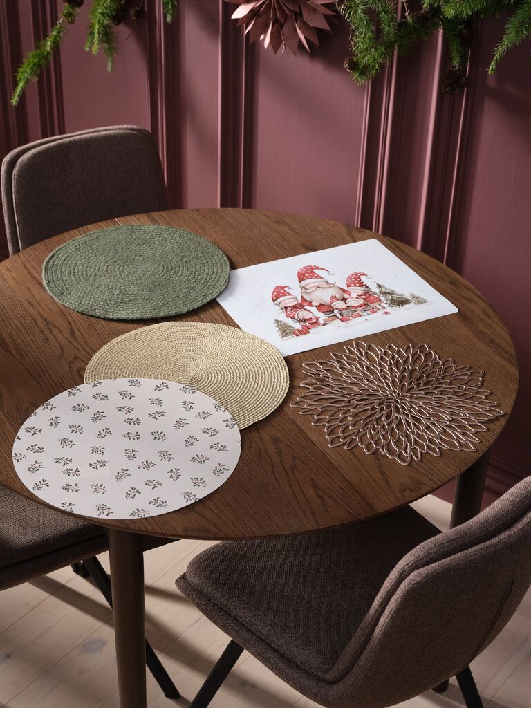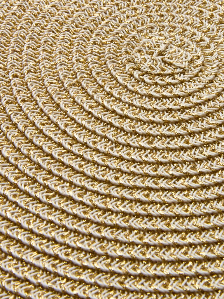 Șervet de masă cu design rotund, țesut, realizat din fir auriu și bej. Ideal pentru a crea un aranjament festiv pentru masa de Crăciun, protejând în același timp suprafața mesei de pete. Ø38 cm