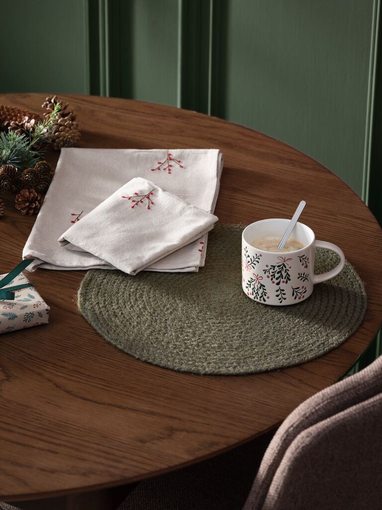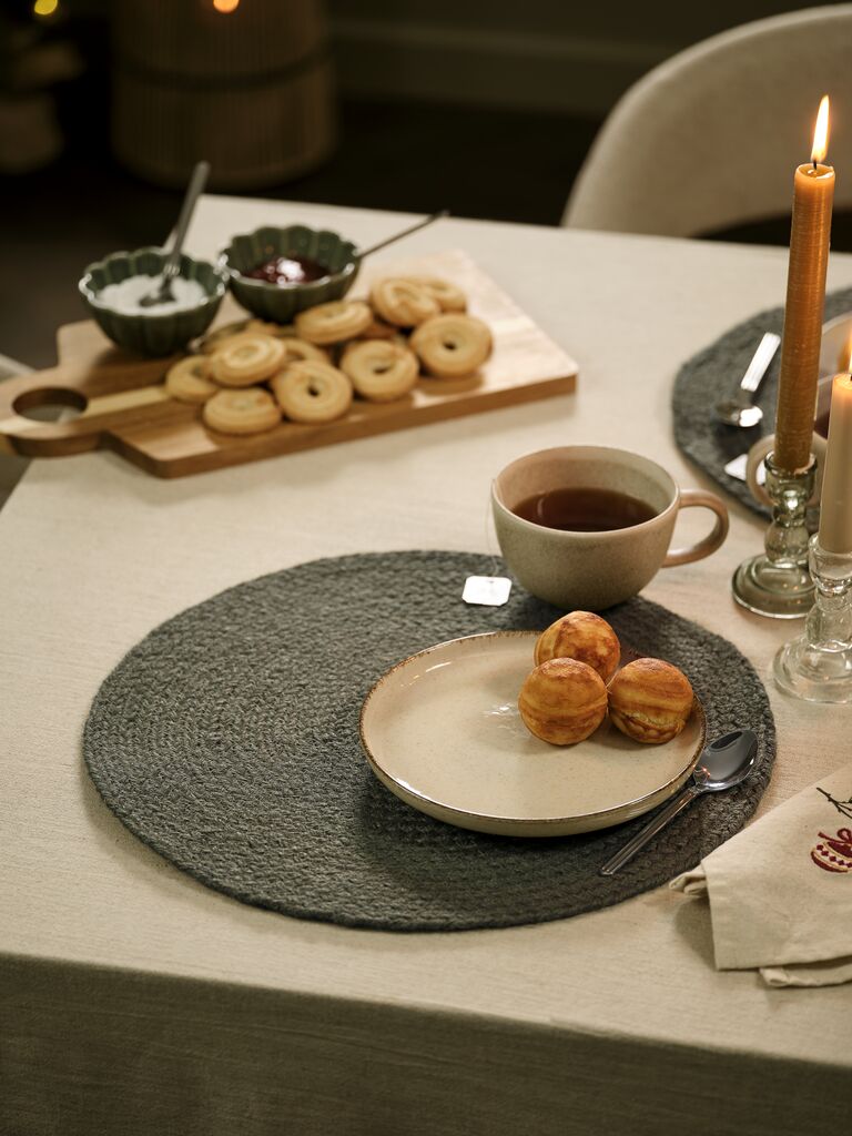 Șervet de masă din iută verde cu un design rotund, țesut. Adaugă un aspect natural, rustic aranjamentului mesei și ajută la protejarea suprafeței mesei. Culoarea și structura poate varia. Ø38 cm