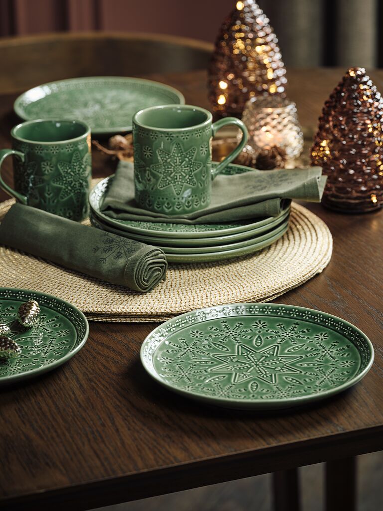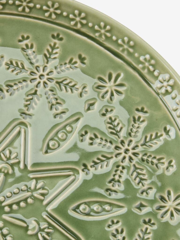 Farfurie verde din porțelan lucios, cu design rustic și model de Crăciun. Folosește-o pe masa de Crăciun pentru deserturi sau aperitive mici. Ø20x2 cm
