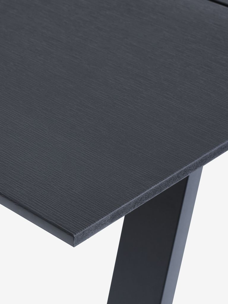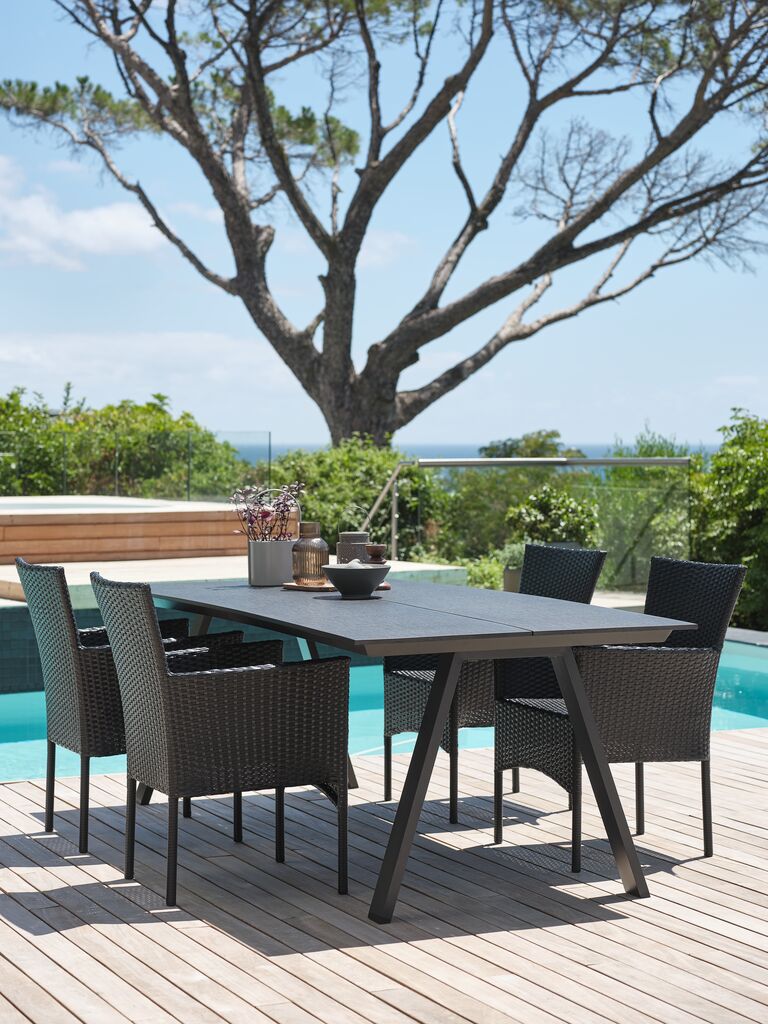 Set de grădină cu 4 locuri. Masă: Aluminiu și lemn compozit DURAWOOD®. 95x207x75 cm Scaun: Plastic cu protecție UV (20% reciclat). Stivuibil