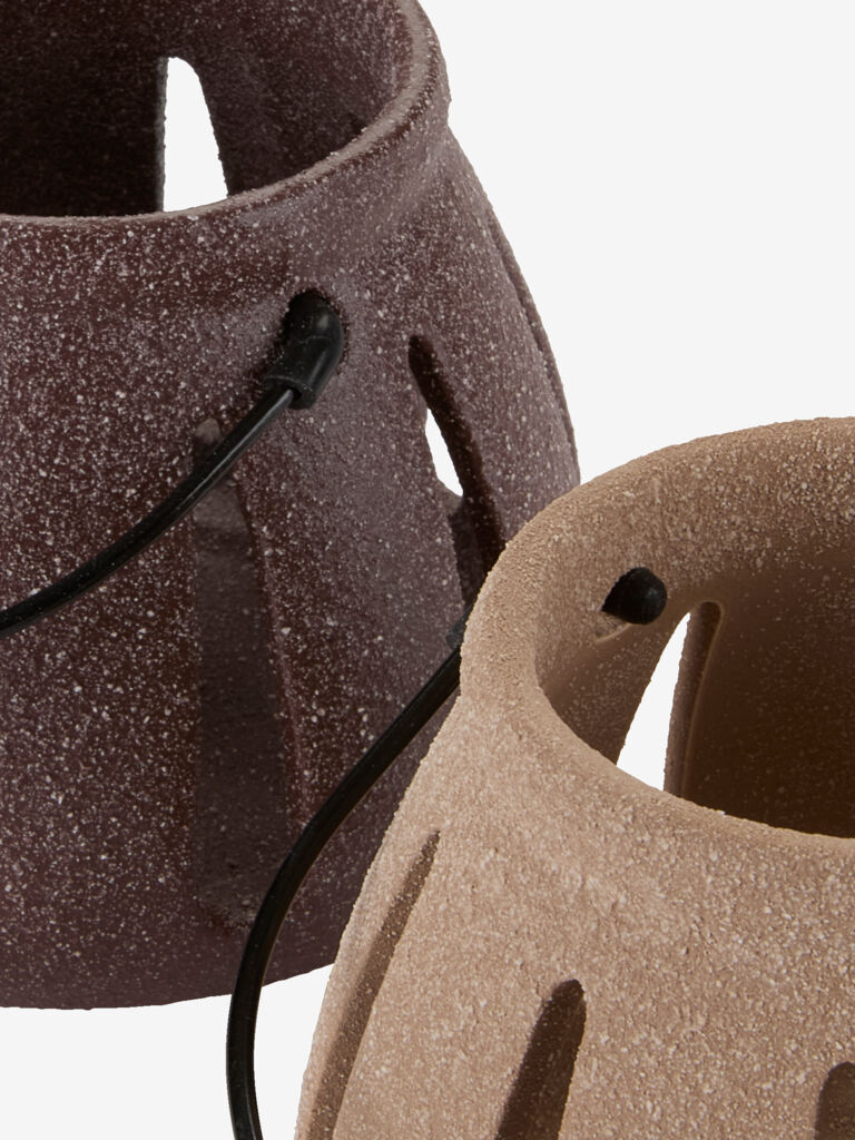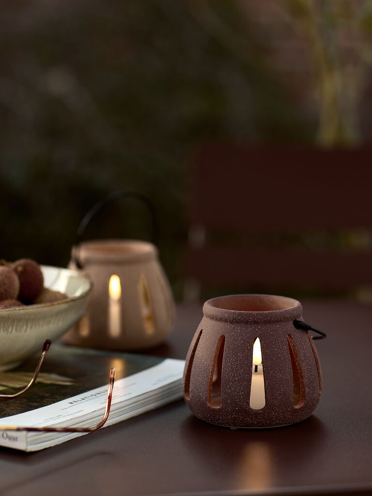 Felinar realizat din ceramică texturată cu decupaje verticale pentru a crea o lumină caldă, decorativă. Dimensiunea sa compactă și mânerul din oțel îl fac ușor de așezat în grădină sau pe balcon. Disponibil în culori variate și vândut individual. Ø10 x H9 cm