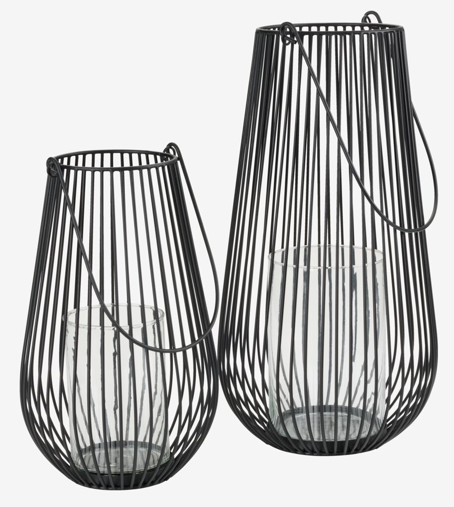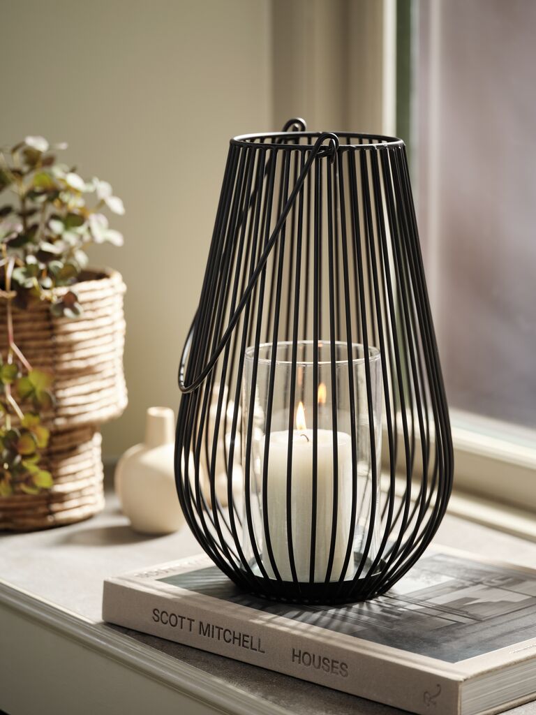 Felinar cu cadru negru din sârmă de oțel și un suport protector din sticlă pentru o lumânare. Designul minimalist este ideal pentru a crea o atmosferă primitoare pe podea sau pe o masă. Ø21x34 cm