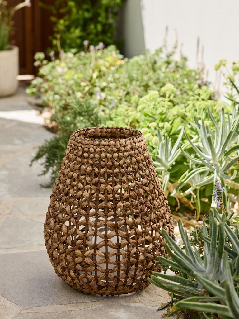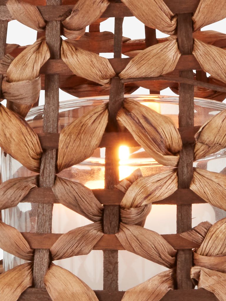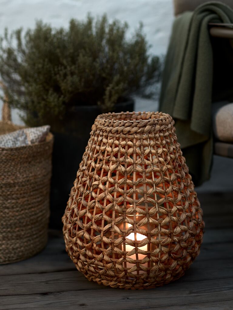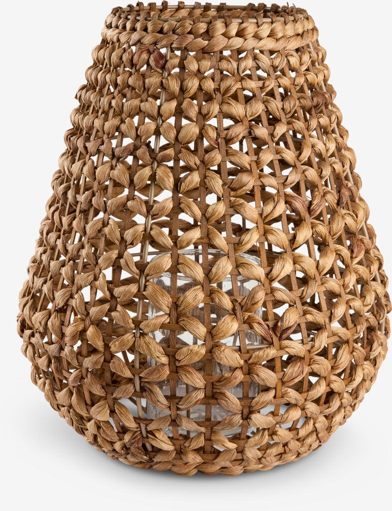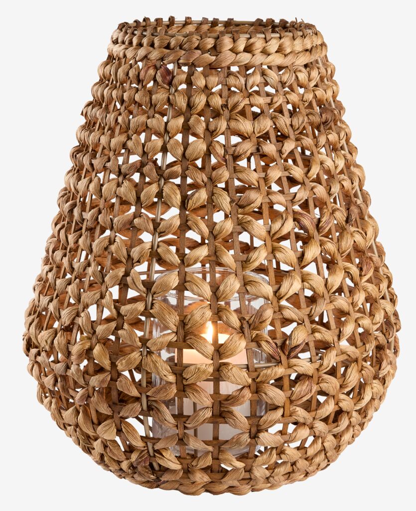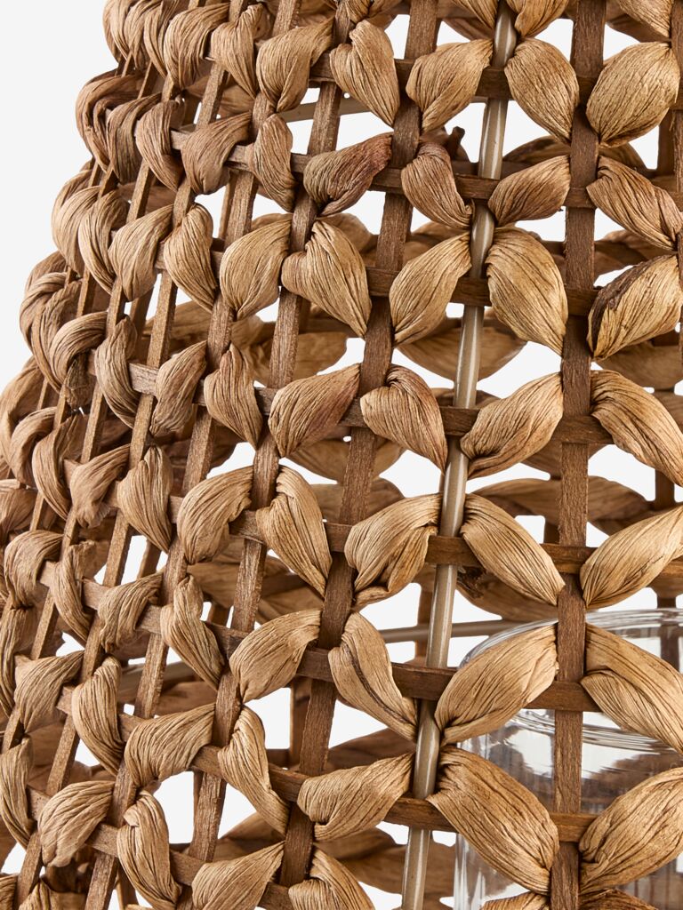 Felinar din oțel și zambilă de apă împletită într-o nuanță caldă de maro, cu un recipient din sticlă în interior. Ø32x38 cm