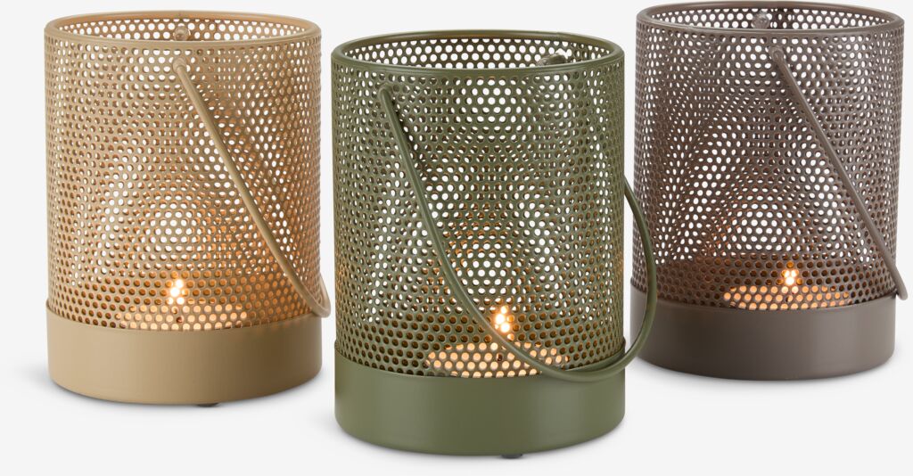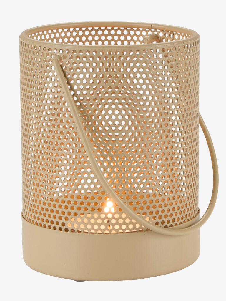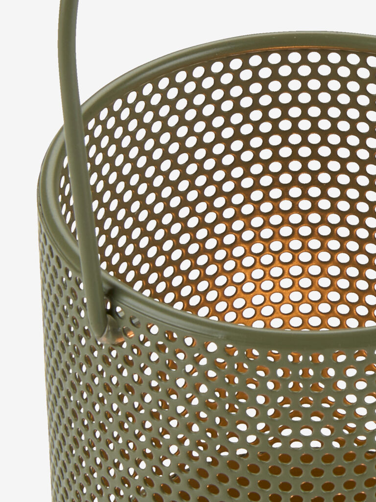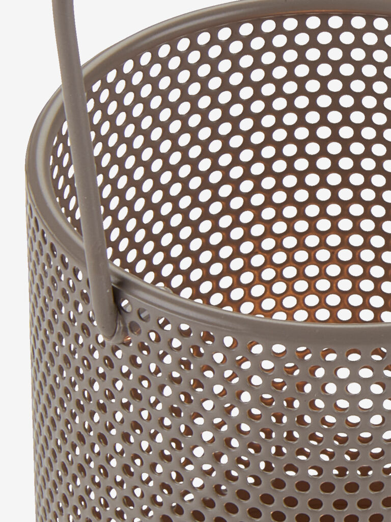 Felinar realizat din oțel vopsit electrostatic, cu un design modern, perforat. Când este aprins, creează un joc frumos de lumini. Dimensiunea sa compactă și mânerul îl fac ușor de amplasat în grădină sau în casă. Disponibil în culori variate și vândut individual. Ø8 x H10 cm