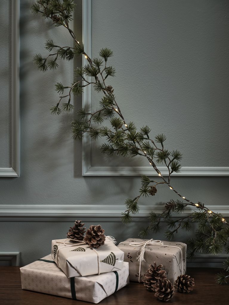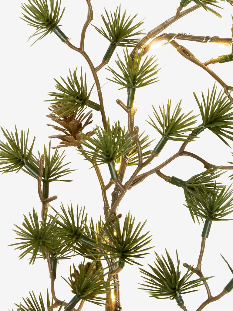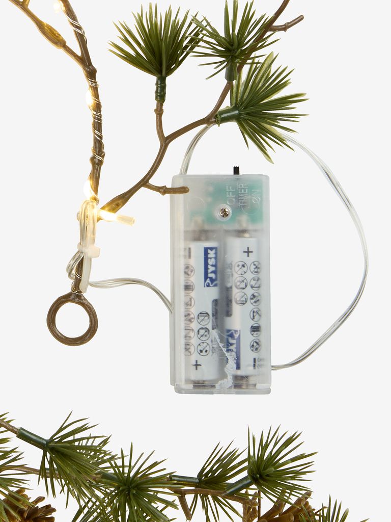 Ghirlandă verde din brad artificial, cu conuri mici și 30 de becuri LED care emană o lumină caldă. Ghirlanda poate fi amplasată oriunde doriți. De asemenea, are funcție de temporizator, fiind aprinsă timp de 6 ore și stinsă timp de 18 ore. Necesită 3 baterii AA (nu sunt incluse). L150 cm