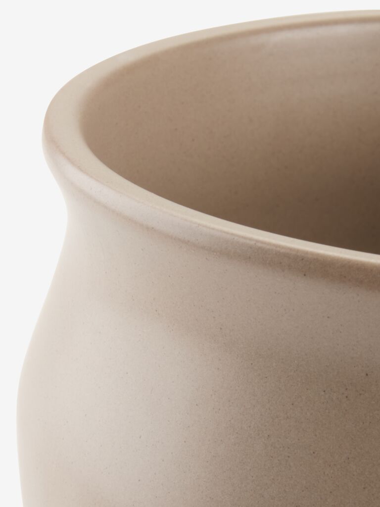 Ghiveci confecționat din ceramică într-o nuanță de gri cald. Ideal pentru plante de dimensiuni medii. Culoarea neutră se potrivește bine cu o varietate de stiluri de design interior. Ø20x17 cm