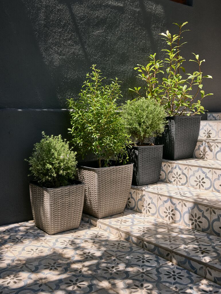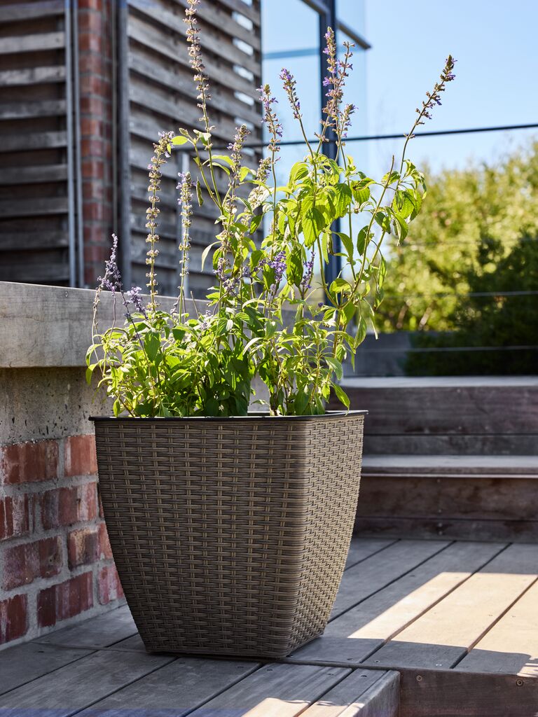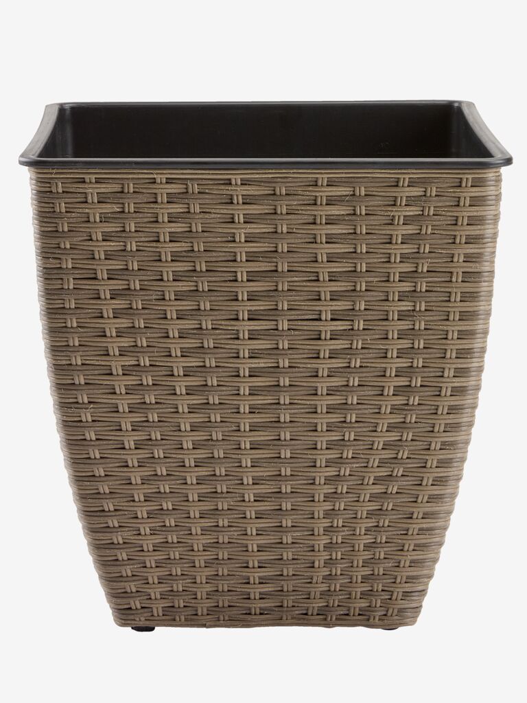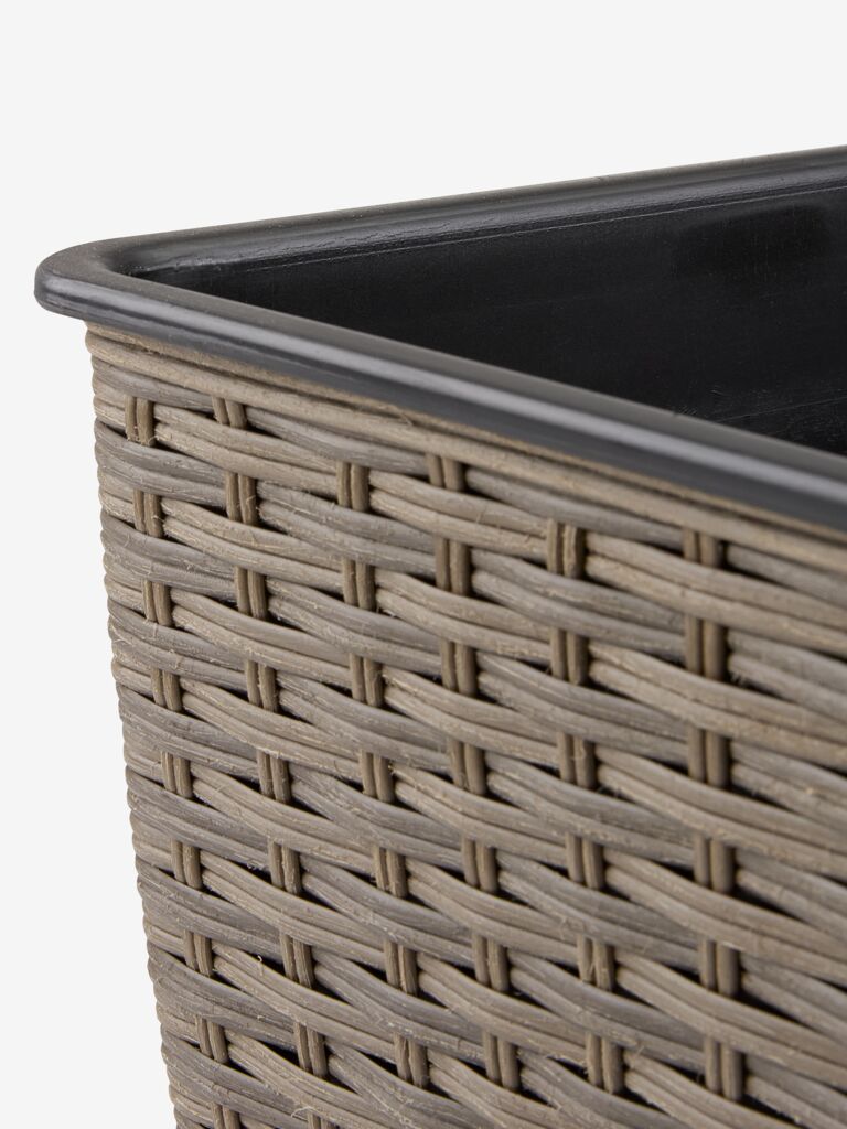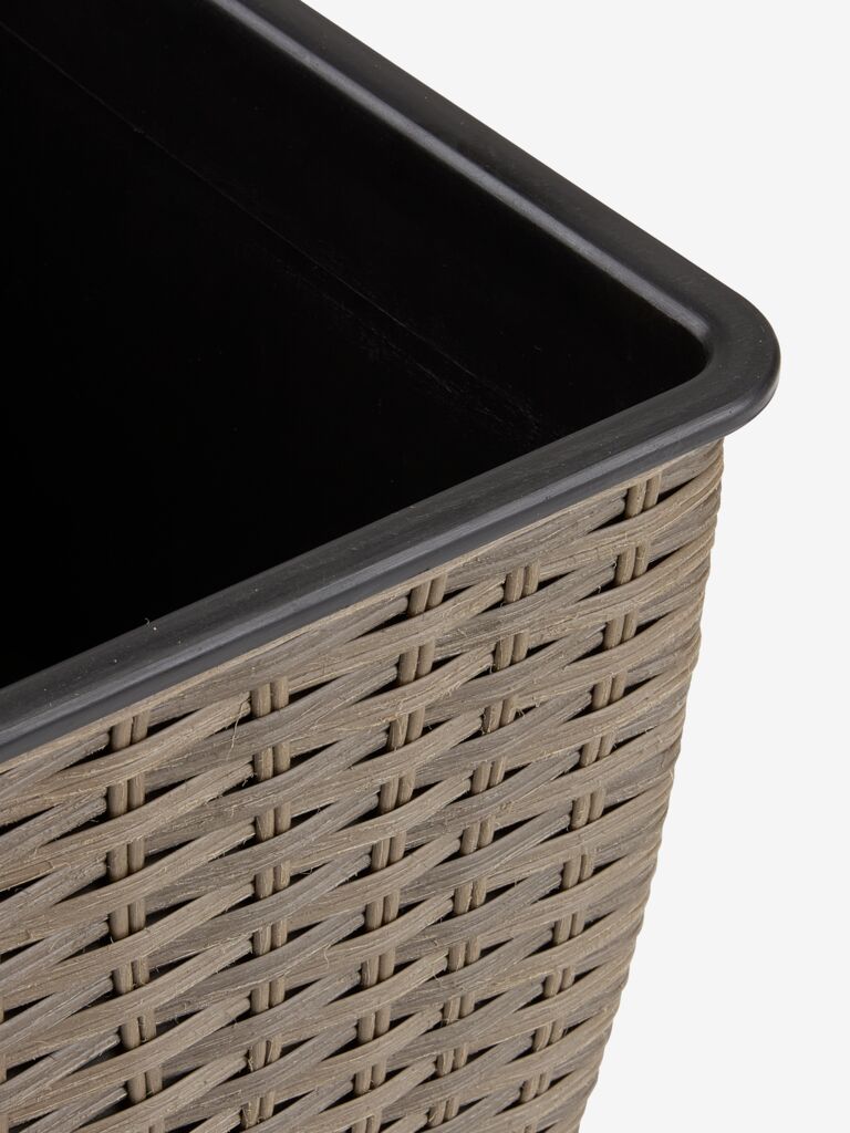 Ghiveci cu design împletit, fabricat din poliratan rezistent. Acest ghiveci ușor și rezistent la îngheț este potrivit pentru grădină sau balcon. Pentru utilizarea la exterior se poate realiza cu ușurință o gaură de scurgere. 38x38x39 cm