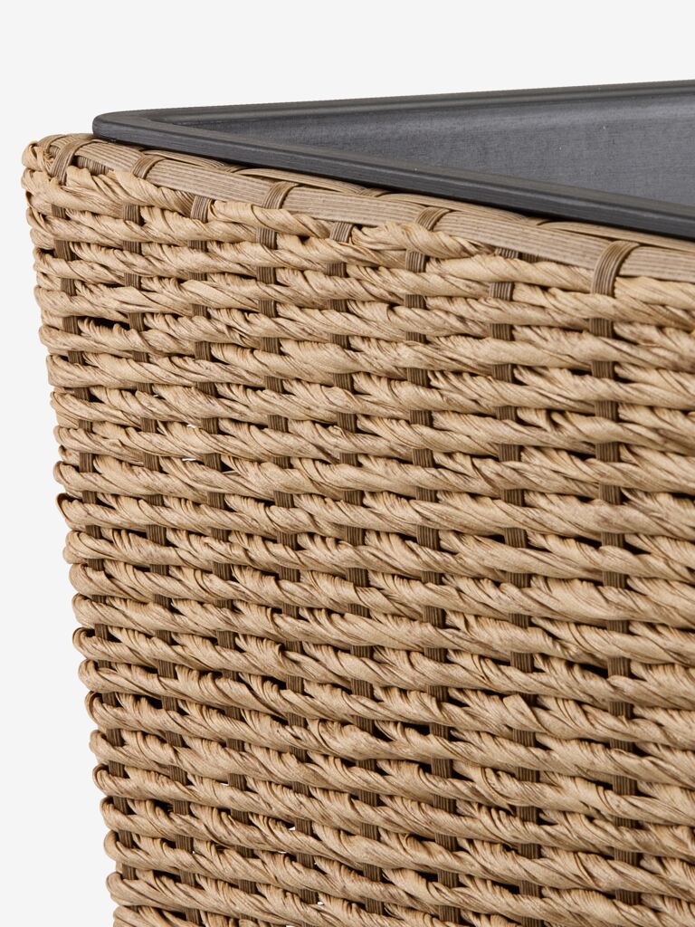 Ghiveci din poliratan împletit de culoare naturală. Designul său înalt este ideal pentru a adăuga înălțime unui aranjament din grădină sau de pe terasă. Ghiveciul este rezistent la îngheț pentru a putea fi utilizat în exterior pe tot parcursul anului. Se poate face cu ușurință o gaură de scurgere. 36x36x70 cm