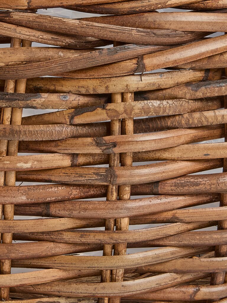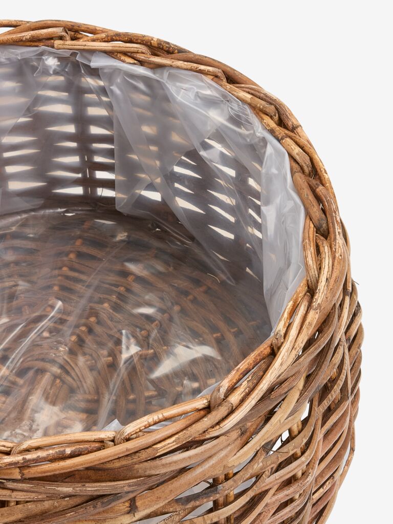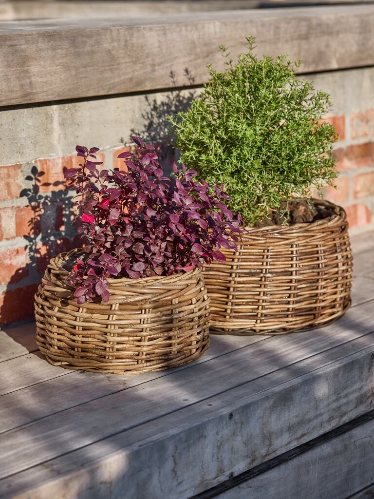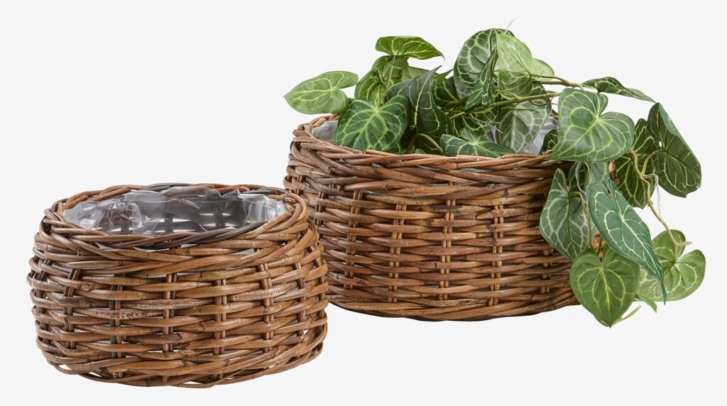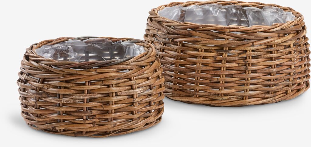 Set de două ghivece, împletite din kubu și ratan natural pentru un aspect rustic, texturat. Fiecare ghiveci este furnizat cu o căptușeală practică din plastic pentru a susține plantele. Ø49/35 x H23/19 cm
