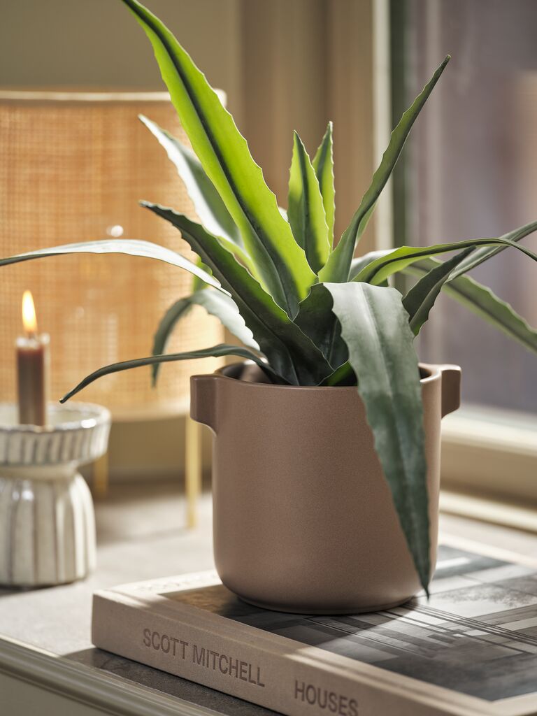 Ghiveci din gresie de culoare nisipiu închis. Designul său simplu, rotunjit, are două mânere decorative mici, ceea ce îl face o alegere ideală pentru a expune plantele tale de interior preferate. Ø13 x H13 cm