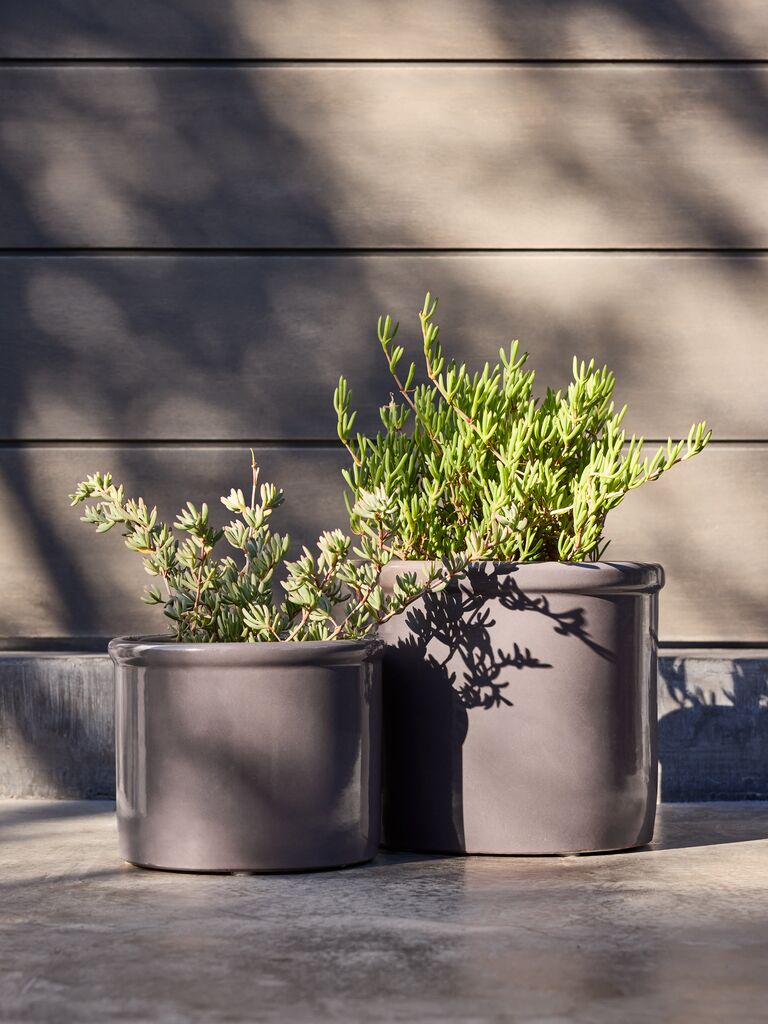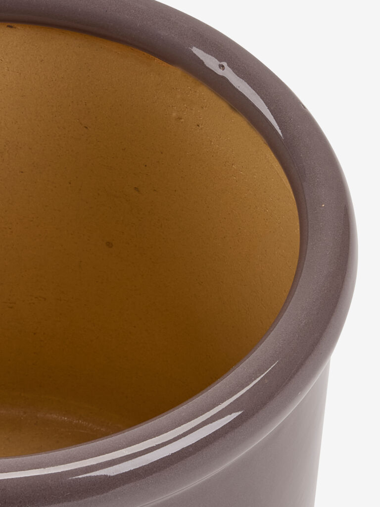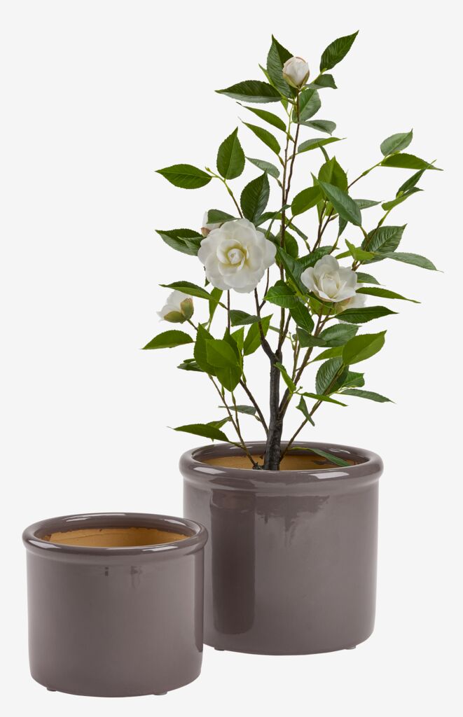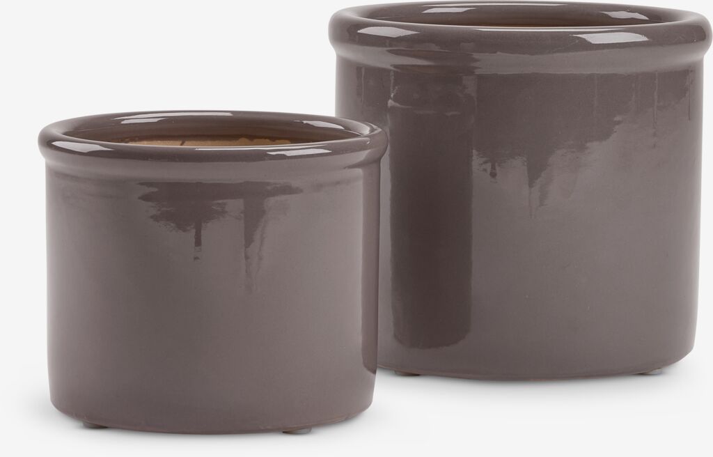 Set de două ghivece de culoare strugurie. Ghivecele sunt fabricate din ceramică rezistentă la îngheț și au un design simplu, rotunjit, cu un finisaj lucios. Fiecare include o gaură de scurgere. Ø28/24 x H24/19 cm