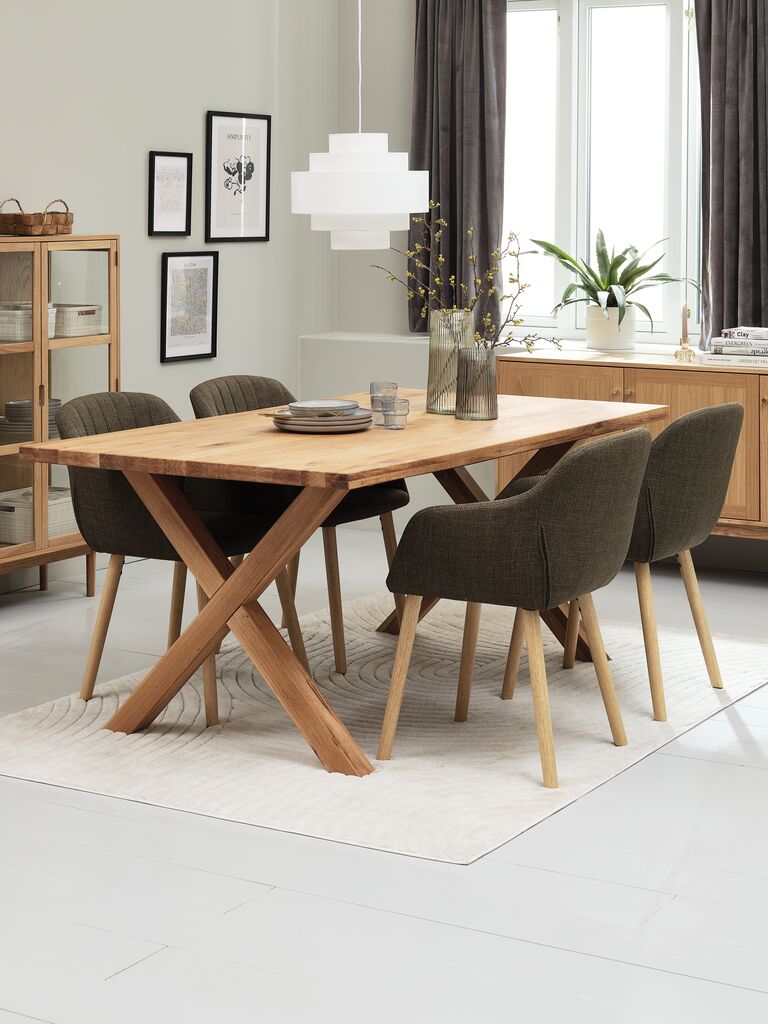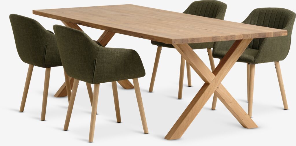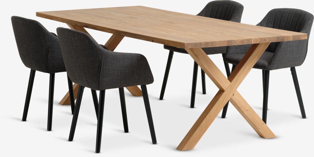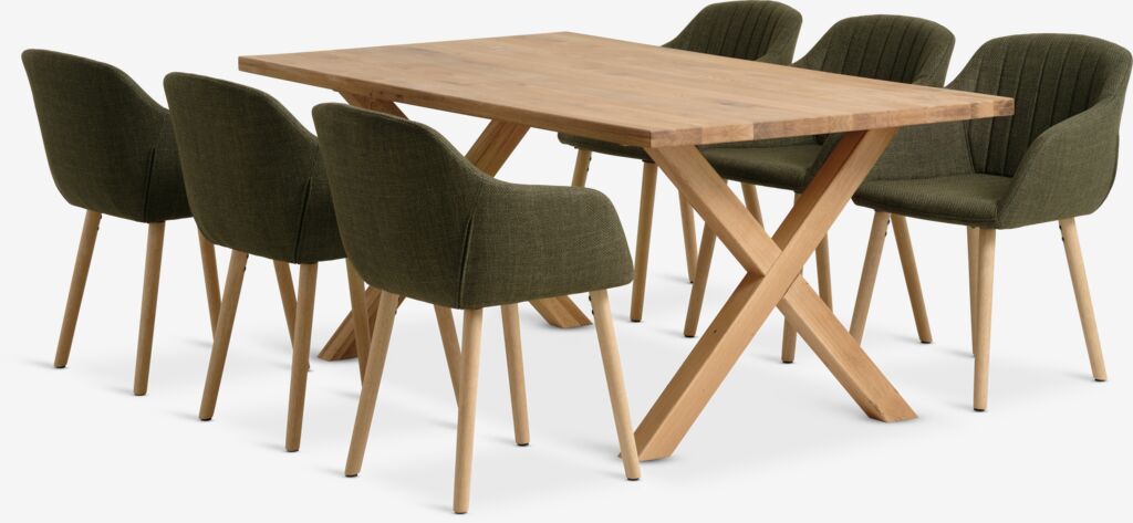 Masă: Lemn masiv de stejar și furnir de stejar. Excl. extensii. 100x180x75 cm Scaun: Material și lemn masiv.