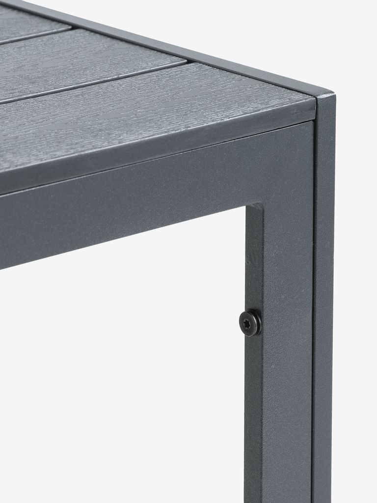 Set de grădină cu 4 locuri. Masă: Aluminiu și lemn artificial. 90x150x74 cm Scaun: Plastic cu protecție UV (20% reciclat). Stivuibil