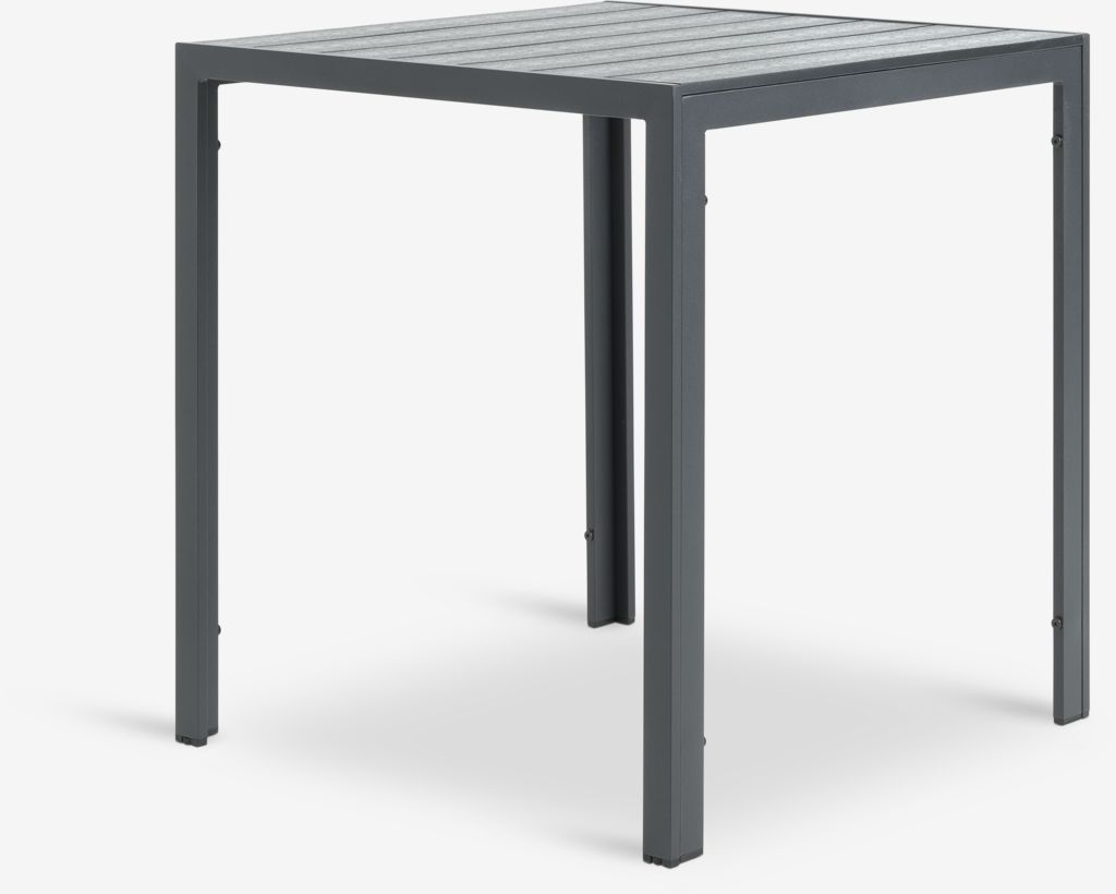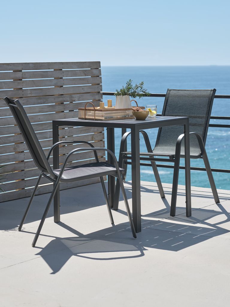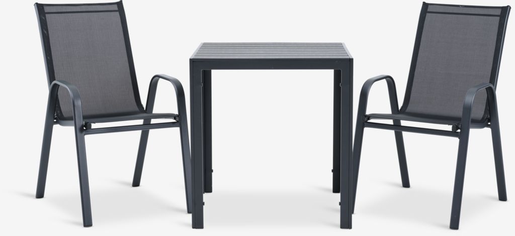 Set de grădină cu 2 locuri. Masă: Aluminiu și lemn artificial. 70x70x74 cm Scaun: Oțel și textilină. Stivuibil.