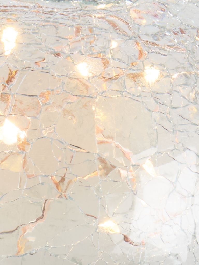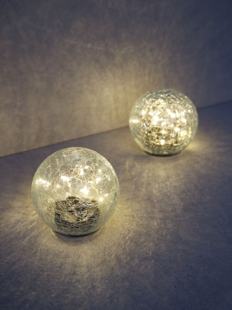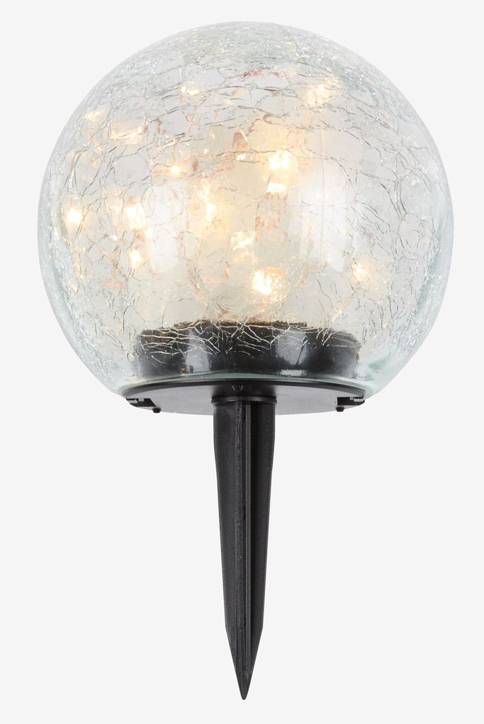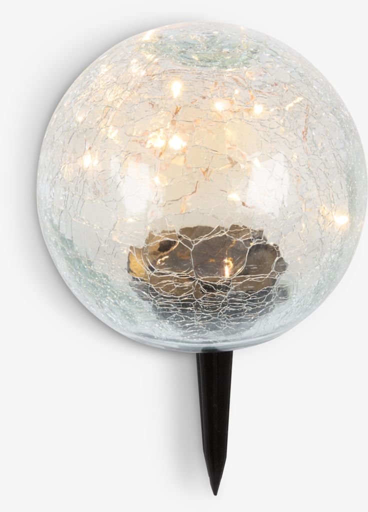 Lampă solară cu glob din sticlă transparentă, cu aspect crăpat. În timpul zilei, panoul solar din interior încarcă bateria, iar la amurg lampa se aprinde automat. Lampa este plasată pe un țăruș, care poate fi ușor înfipt în pământ. Ø15x25 cm