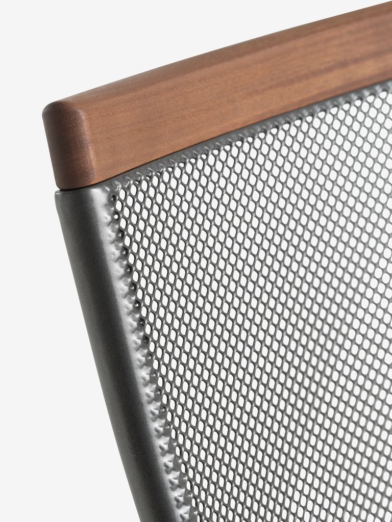 Scaun reglabil gri cu șezut și spătar din plasa de oțel și cadru din aluminiu. Cotierele și marginea superioară a spătarului sunt finisate cu lemn de esență tare FSC®, tratat cu ulei pentru un aspect elegant. Spătarul poate fi înclinat în 5 poziții. Oțelul este tratat cu un strat Durasint® care previne rugina, iar lemnul durabil este tratat cu ulei pentru a-l proteja și a-i evidenția culoarea naturală.