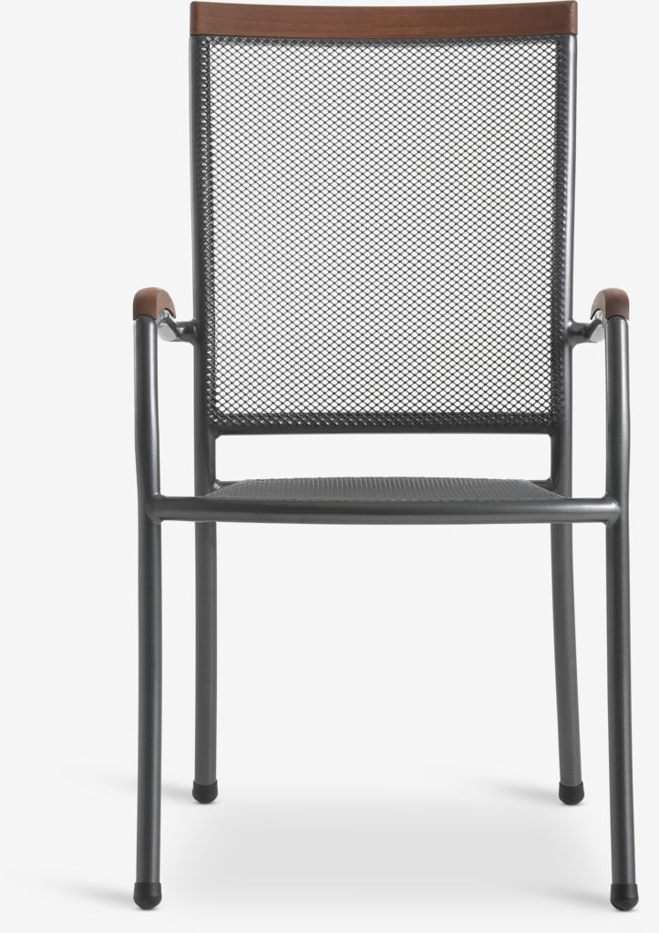 Scaun stivuibil gri cu șezut și spătar din plasă de oțel și cadru din oțel. Cotierele și marginea superioară a spătarului sunt finisate cu lemn de esență tare FSC®, tratat cu ulei pentru un aspect elegant. Oțelul este tratat cu un strat Durasint® anti rugină. Lemnul durabil este tratat cu ulei pentru a-l proteja și a-i evidenția culoarea naturală. Se recomandă tratarea regulată a lemnului pentru a-și menține culoarea și a-l proteja de umiditate.
