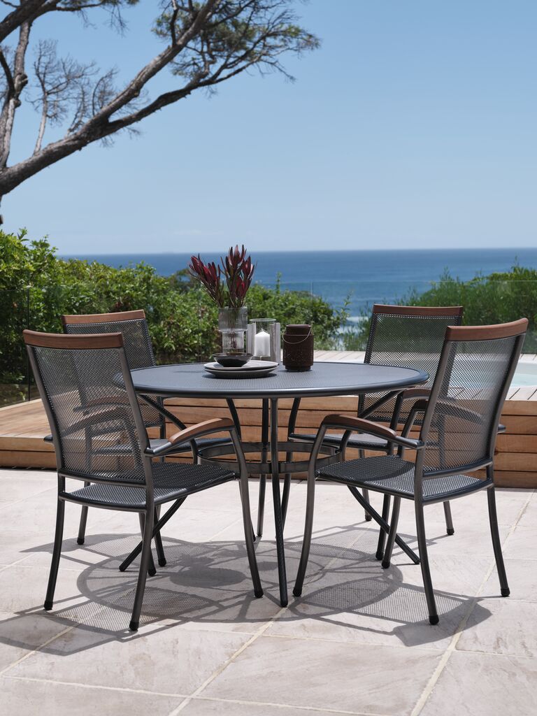 Set de grădină cu 4 locuri. Masă: Aluminiu și oțel. Cu tratament împotriva ruginii Durasint®. Ø120x74 cm Scaun: Aluminiu și lemn de esență tare FSC®, tratat cu ulei. Cu tratament împotriva ruginii Durasint®. Stivuibil.