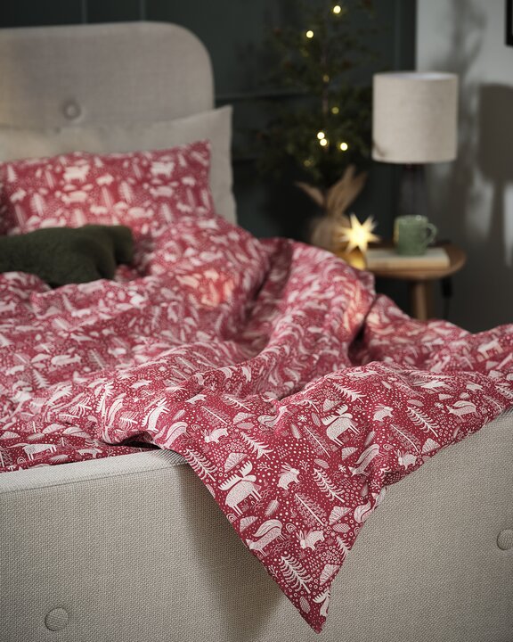Set de lenjerie de pat din bumbac 100%, cu un model festiv de Crăciun cu motive de pădure pe un fundal roșu. Acest design creează o atmosferă caldă de Crăciun în dormitorul tău. Setul include o husă de pilotă și o față de pernă, ambele cu fermoar convenabil. 200x220 cm