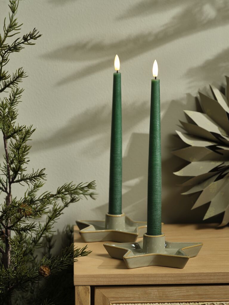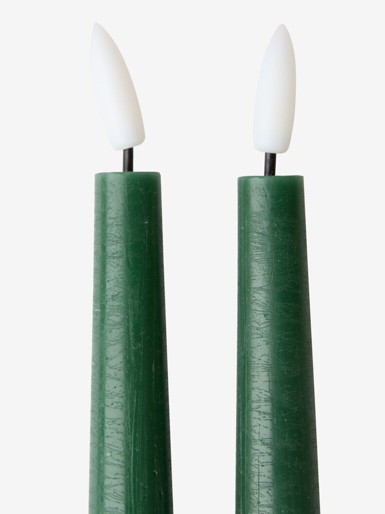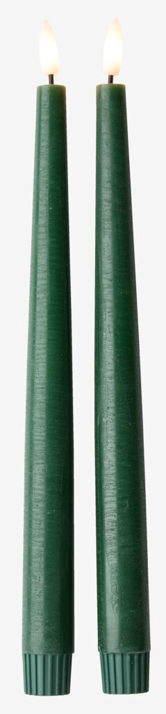 Set de 2 lumânări LED de culoare verde închis, perfecte ca decorațiuni de Crăciun. Lumânările au un finisaj din ceară adevărată care le conferă un aspect realist. Necesită 4 baterii AAA (neincluse). Ø2x29 cm