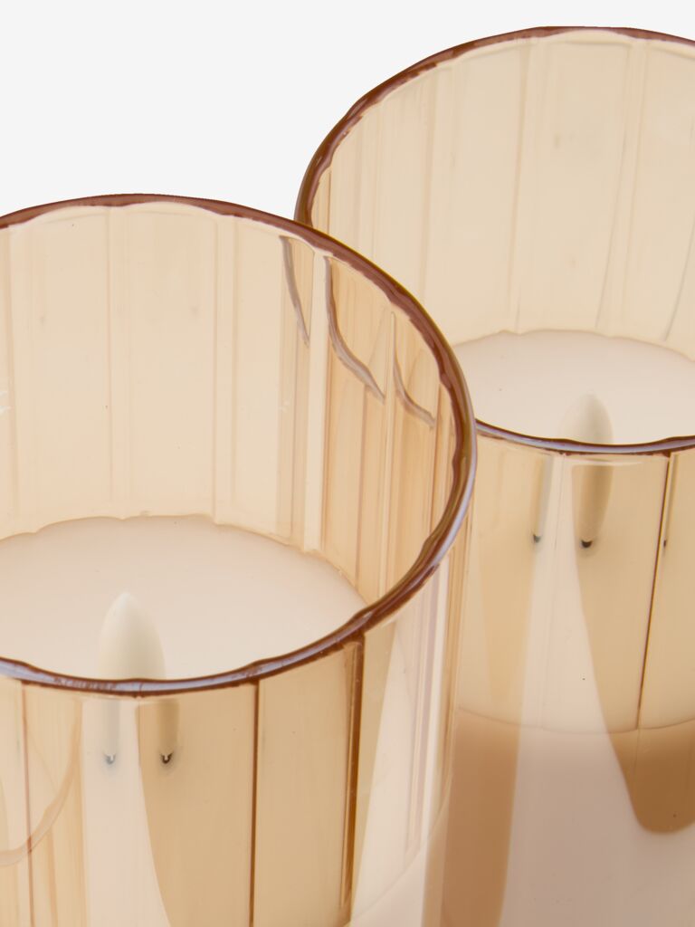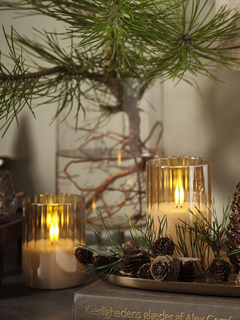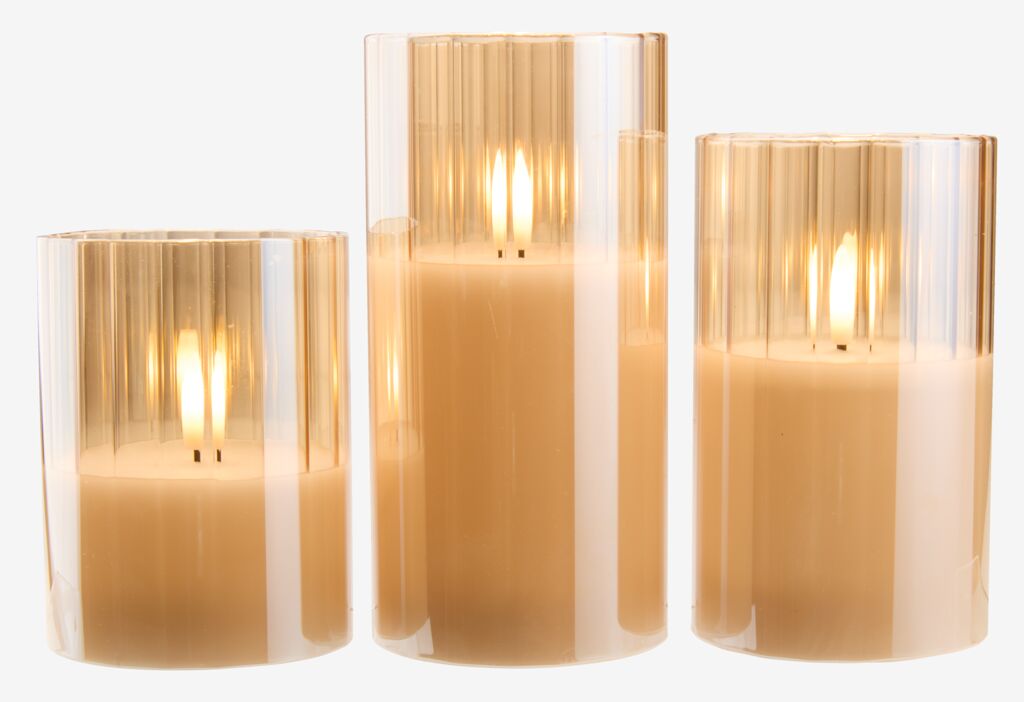 Set de 3 lumânări groase LED cu înălțimi diferite. Lumânările sunt așezate în recipiente elegante din sticlă aurie. Lumânările au o funcție de temporizator care este pornită timp de 6 ore și oprită timp de 18 ore. Necesită 2 baterii AA (neincluse). Ø7,5x10,12,15 cm