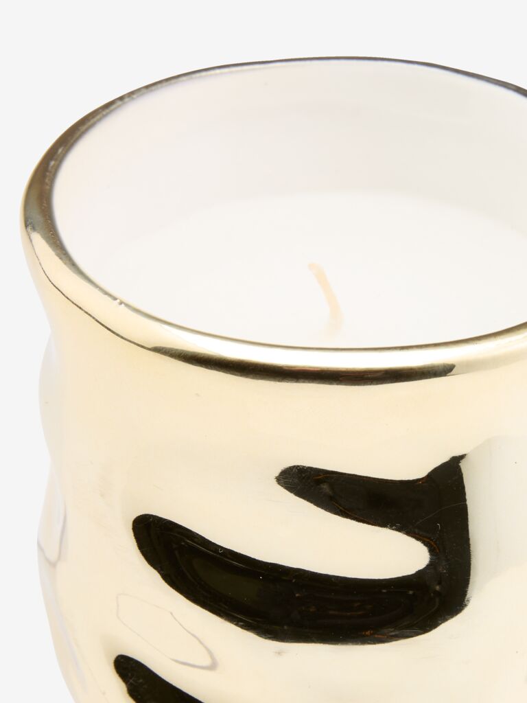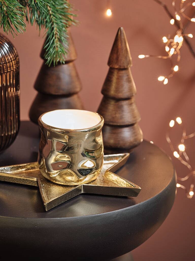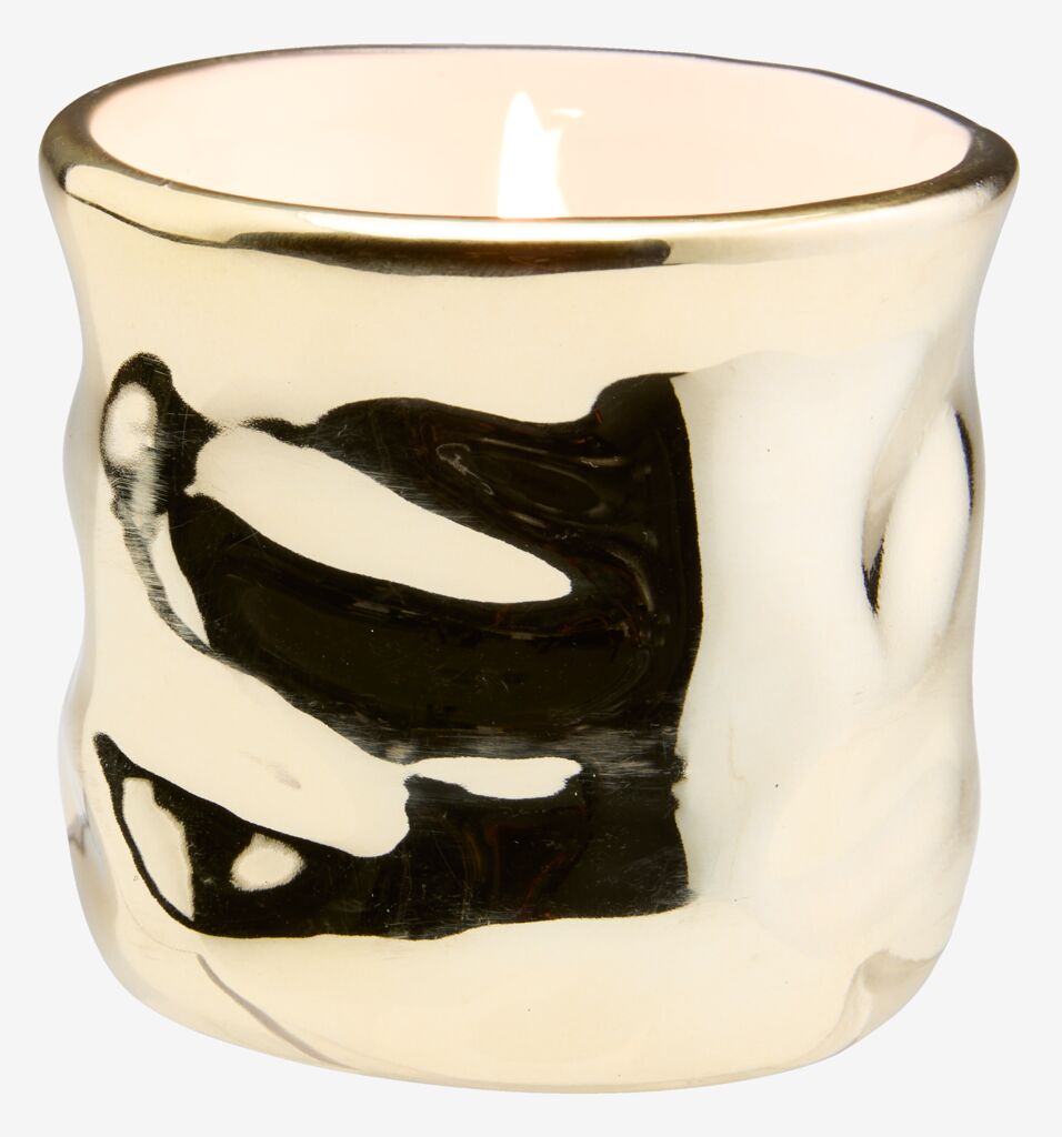 Lumânare într-un vas auriu din ceramică. Finisajul metalizat oferă o strălucire festivă, fiind o piesă decorativă simplă, dar elegantă pentru perioada Crăciunului. Ø8x7 cm