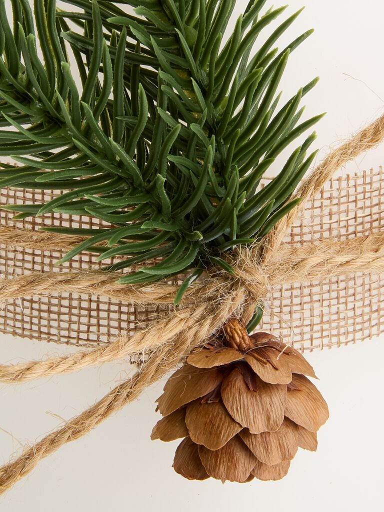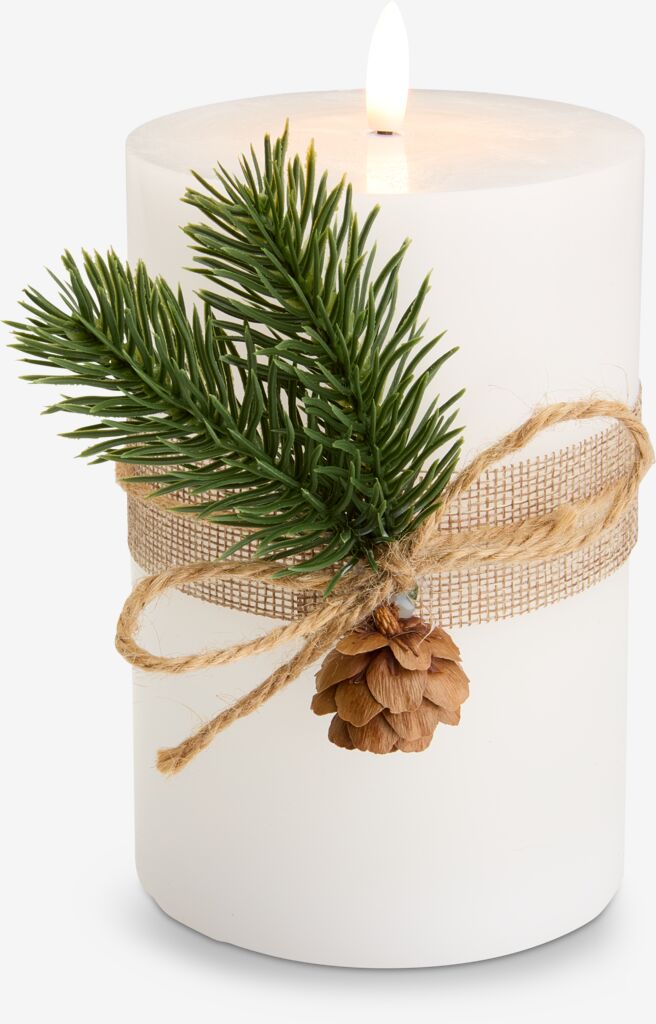 Lumânare groasă LED albă cu aspect realist, din parafină. Frumos decorată cu o panglică și o crenguță. Are funcție de temporizator care o aprinde timp de 6 ore și o stinge timp de 18 ore. Necesită 2 baterii AA (neincluse). Ø10x15 cm