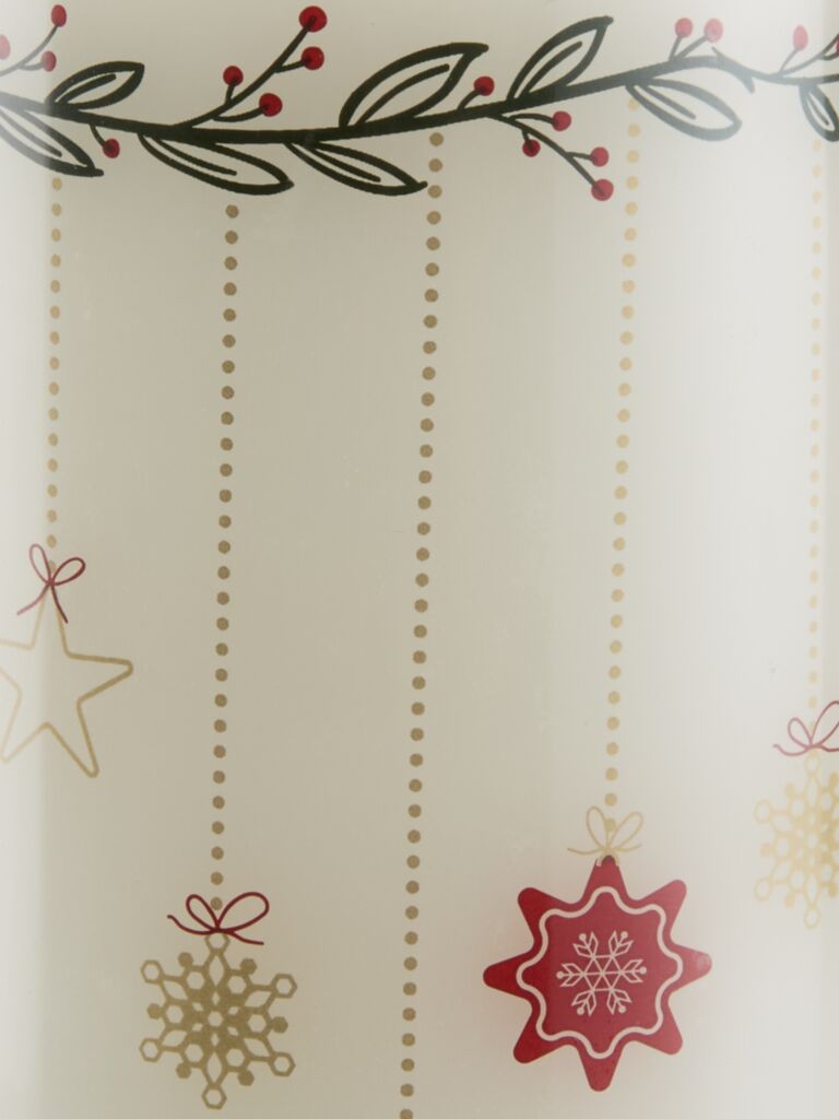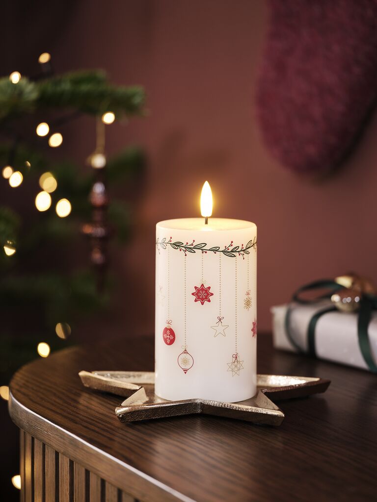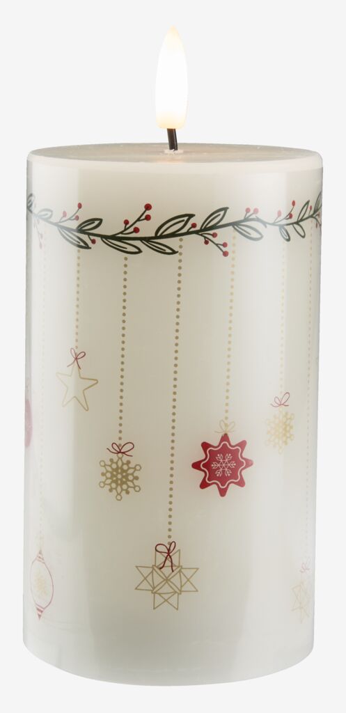 Lumânare LED albă, fabricată din ceară adevărată și decorată cu elemente simple de Crăciun. Ideală pentru decorarea casei sau pentru masa de Crăciun. Necesită 2 baterii AA (nu sunt incluse). D13 x Ø8 cm