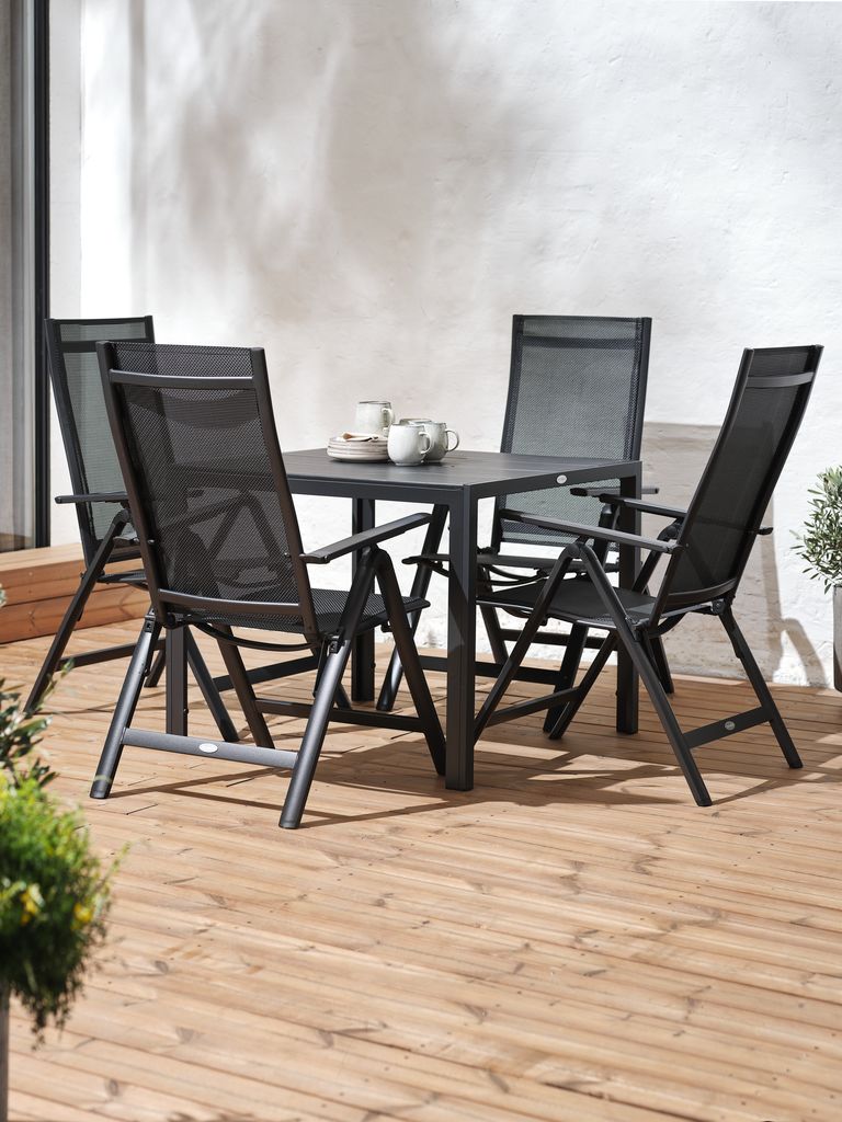 Set de grădină cu 4 locuri. Masă: Aluminiu și lemn artificial. 90x90x74 cm Scaun: Aluminiu și textilină. 6 poziții. Pliabil.